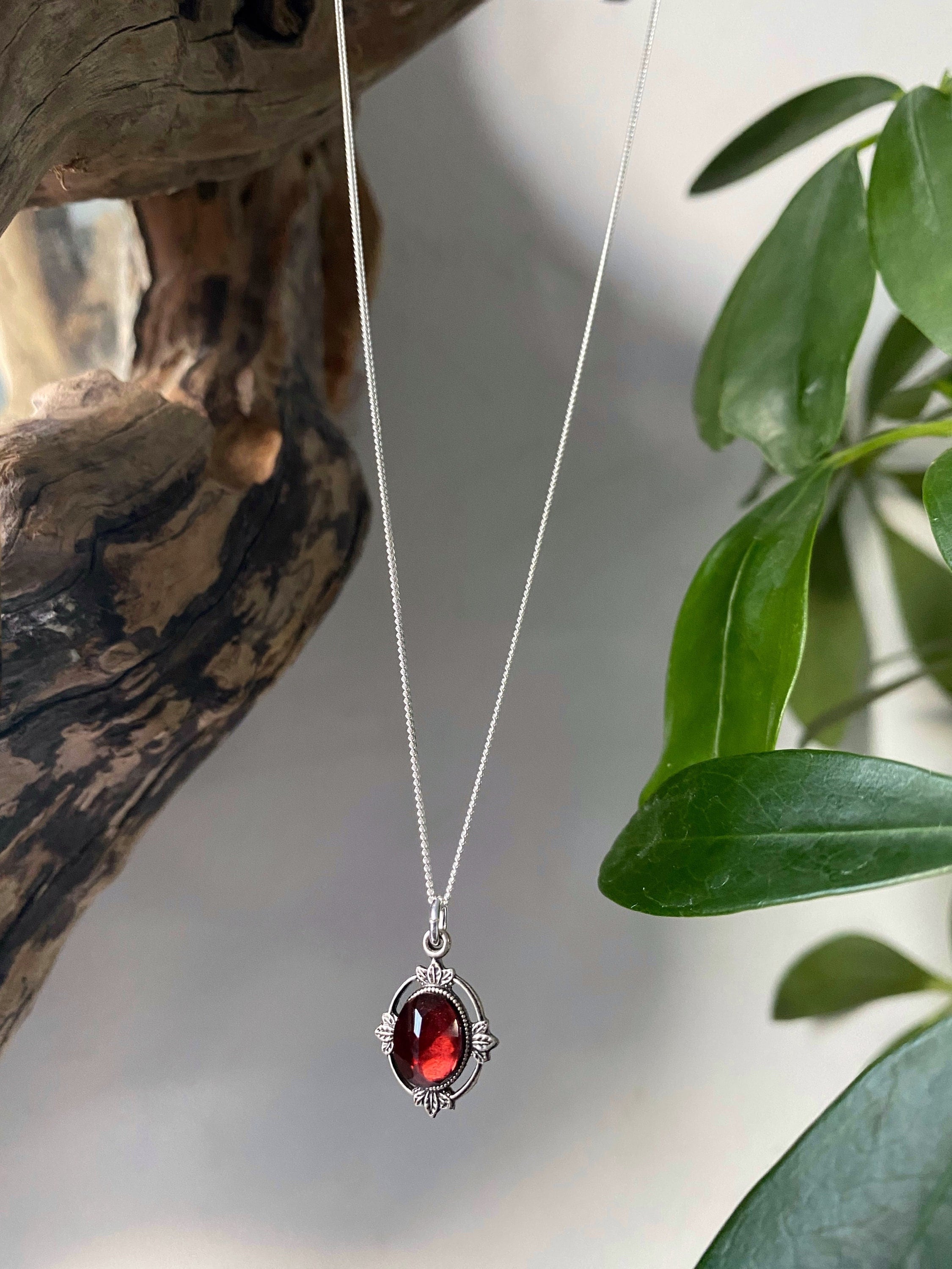 A one of a kind sterling silver necklace with a striking red garnet on a dainty antique silver plate...