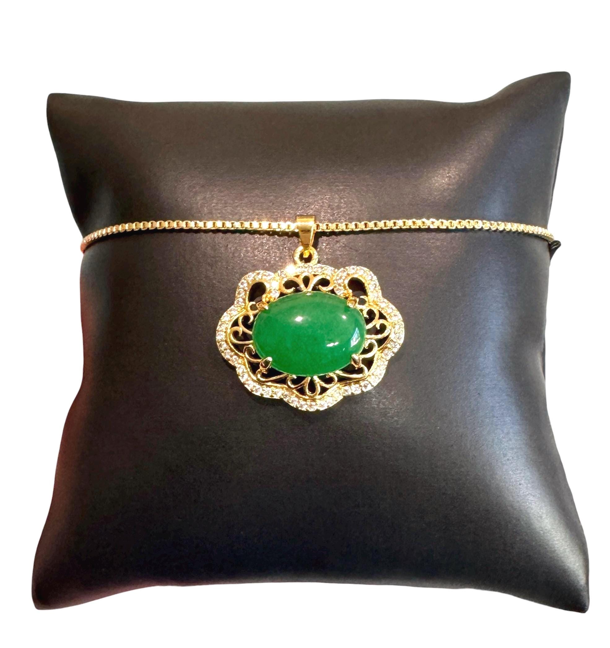 - 18K Gold plated jade pendant encrusted with cubic zirconia stones - Abstract design of a lotus flo...