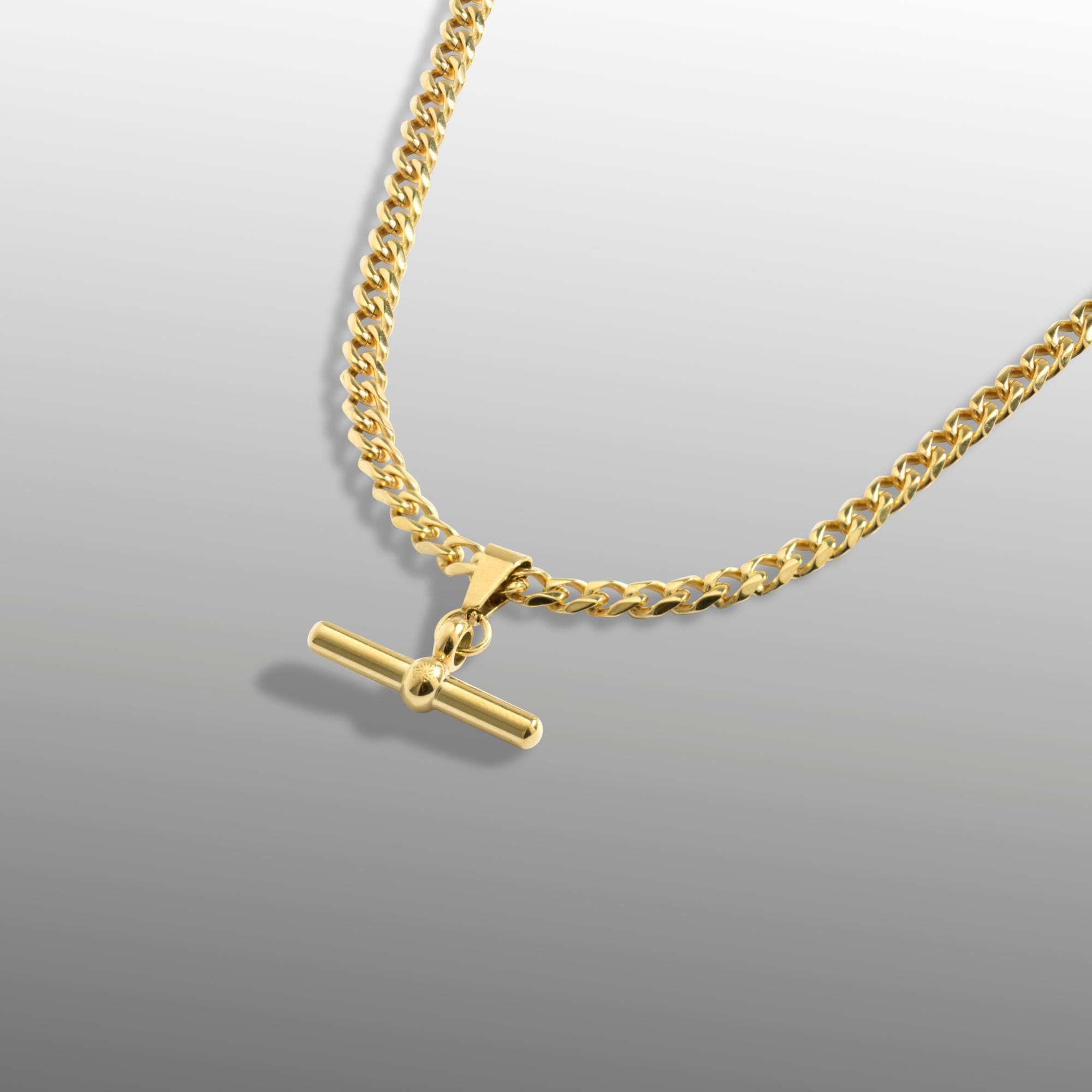 "18K Gold T-Bar Pendant on a 4mm Curb Chain Necklace This is a unisex piece with multiple chain...
