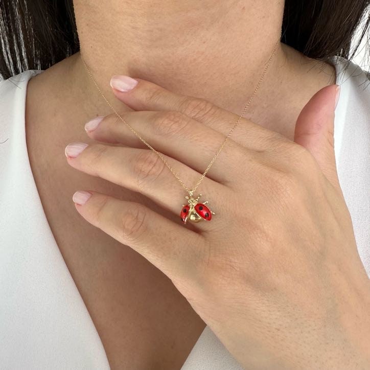 "14K Solid Gold Ladybug Necklace, Red Enameled Ladybug Charm, Gold Ladybug Pendant In many cult...