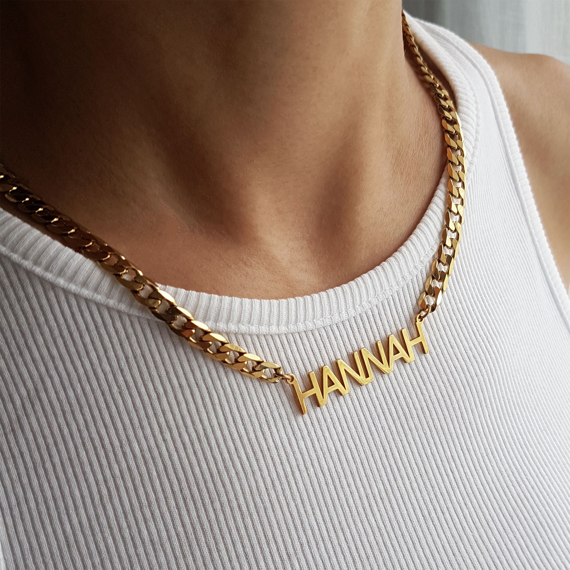 Hannah Gold name necklace with curb chain. This is a large silver necklace with 14k gold plating. Th...