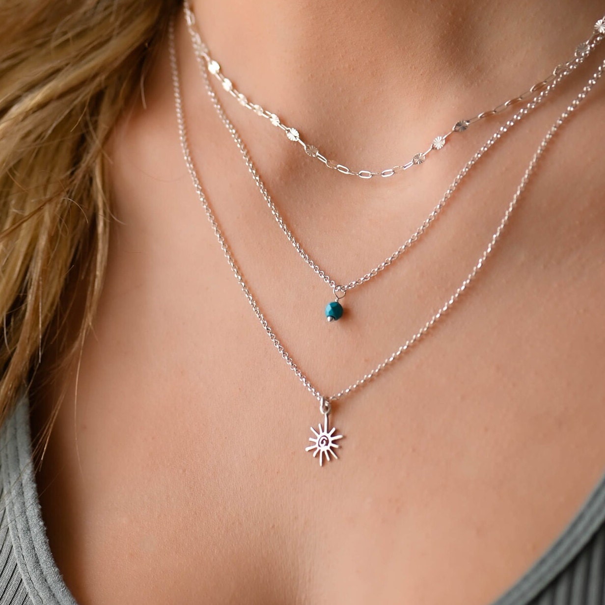 This layered silver sun and stone necklace is a set of 3. The chains are solid sterling silver 925. ...