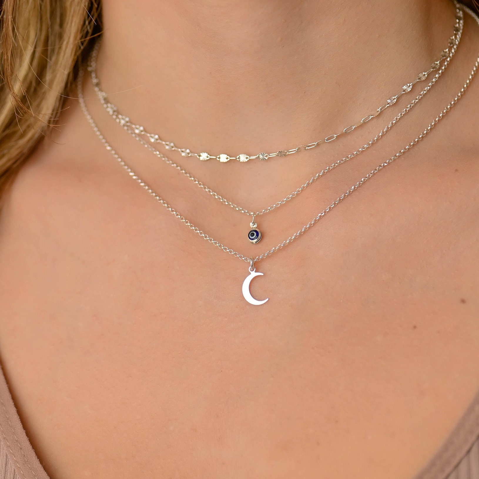 This layered moon and evil eye necklace is a set of 3. The chains are solid sterling silver 925. The...