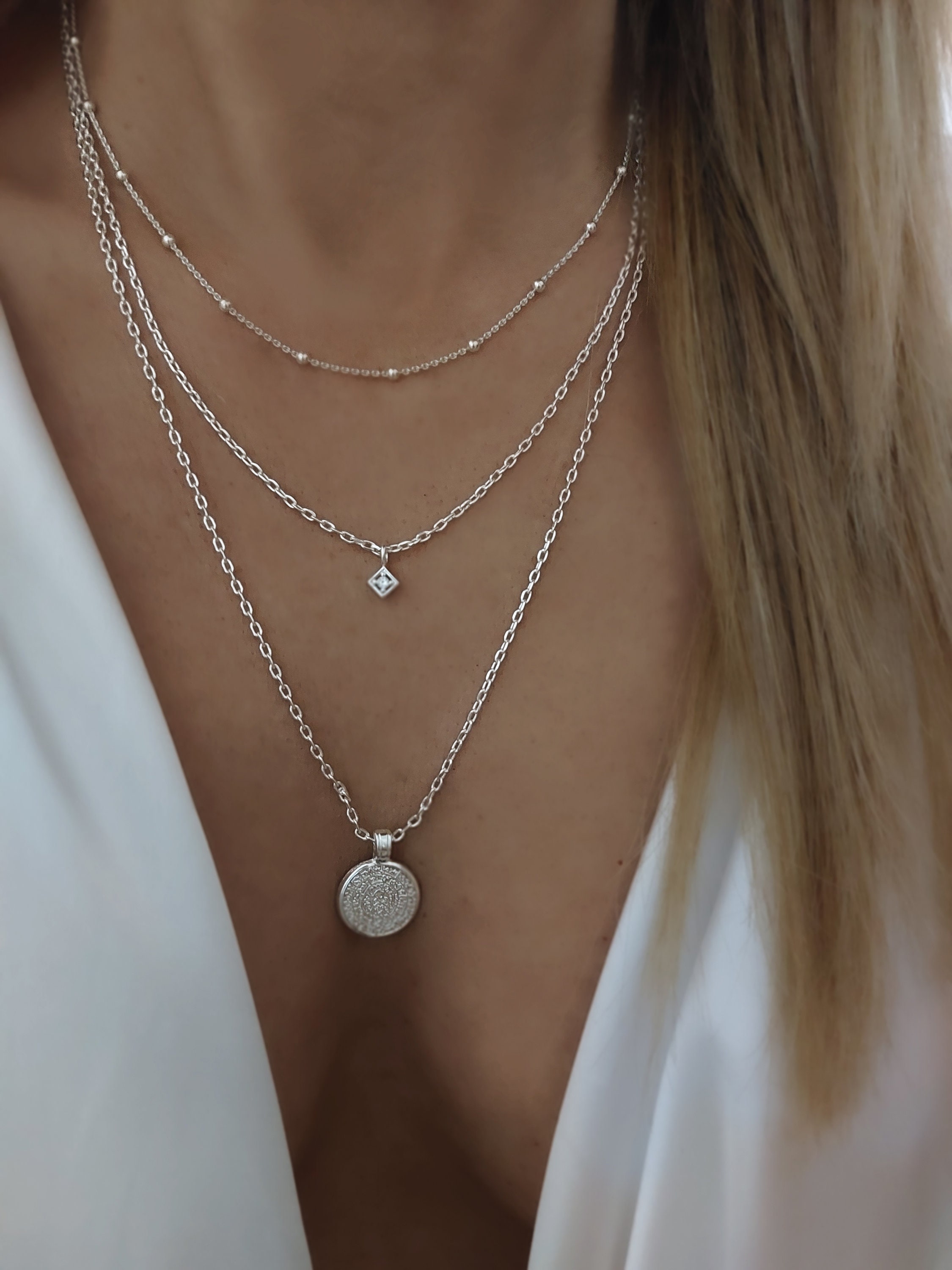 Layered 925 Necklace Set, Silver Multi Strand Necklace, Layered Sil...