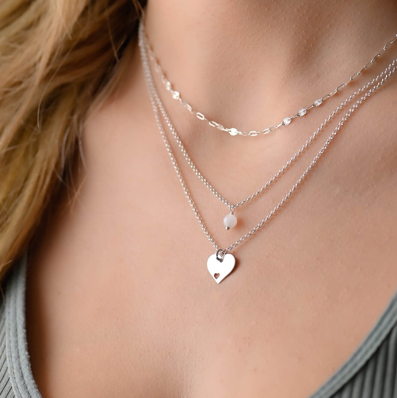 This layered silver heart and stone necklace is a set of 3. The chains are solid sterling silver 925...