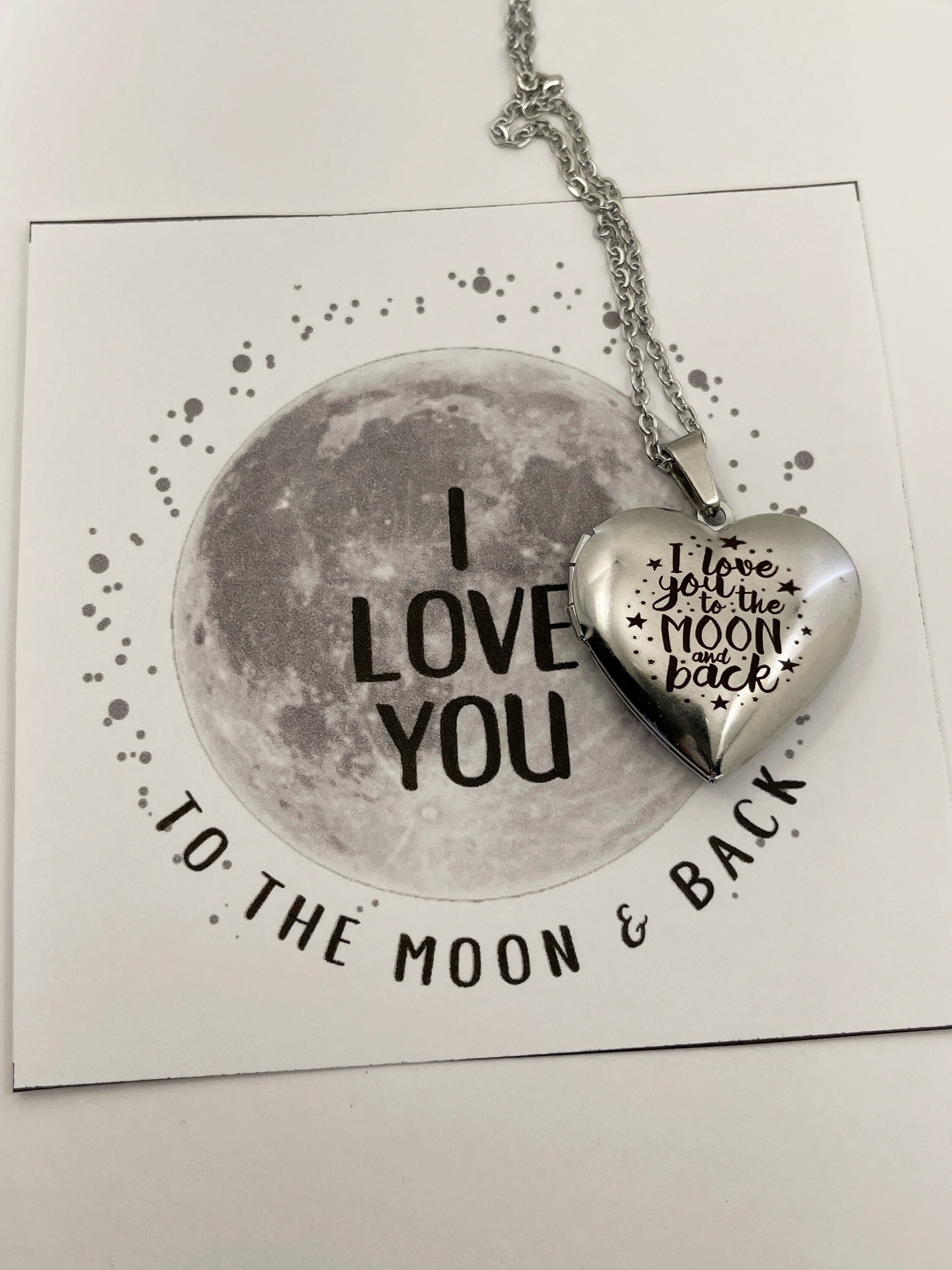"I love you to the moon and back, Stainless steel heart locket, I love you to the moon and back...