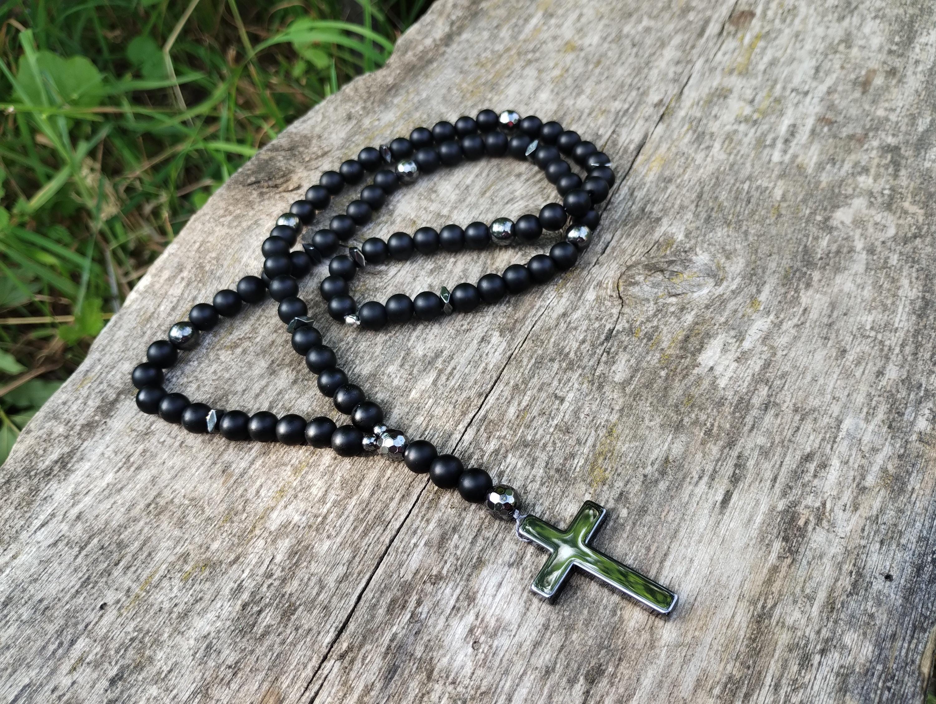 Gemstone rosary Mens Cross necklace black Mens rosary necklace Shun...