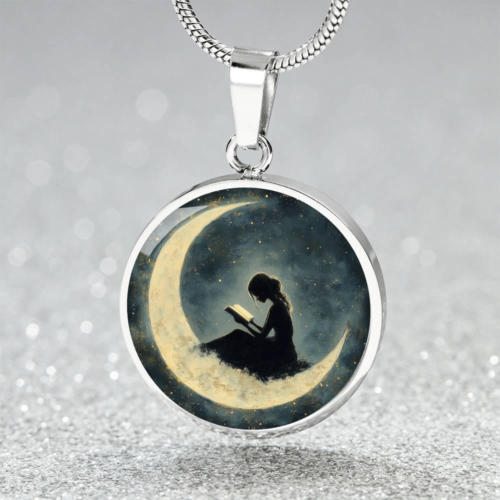 Reading Moon Lady Charm Pendant Necklace | Engraved Books Charm Bra...