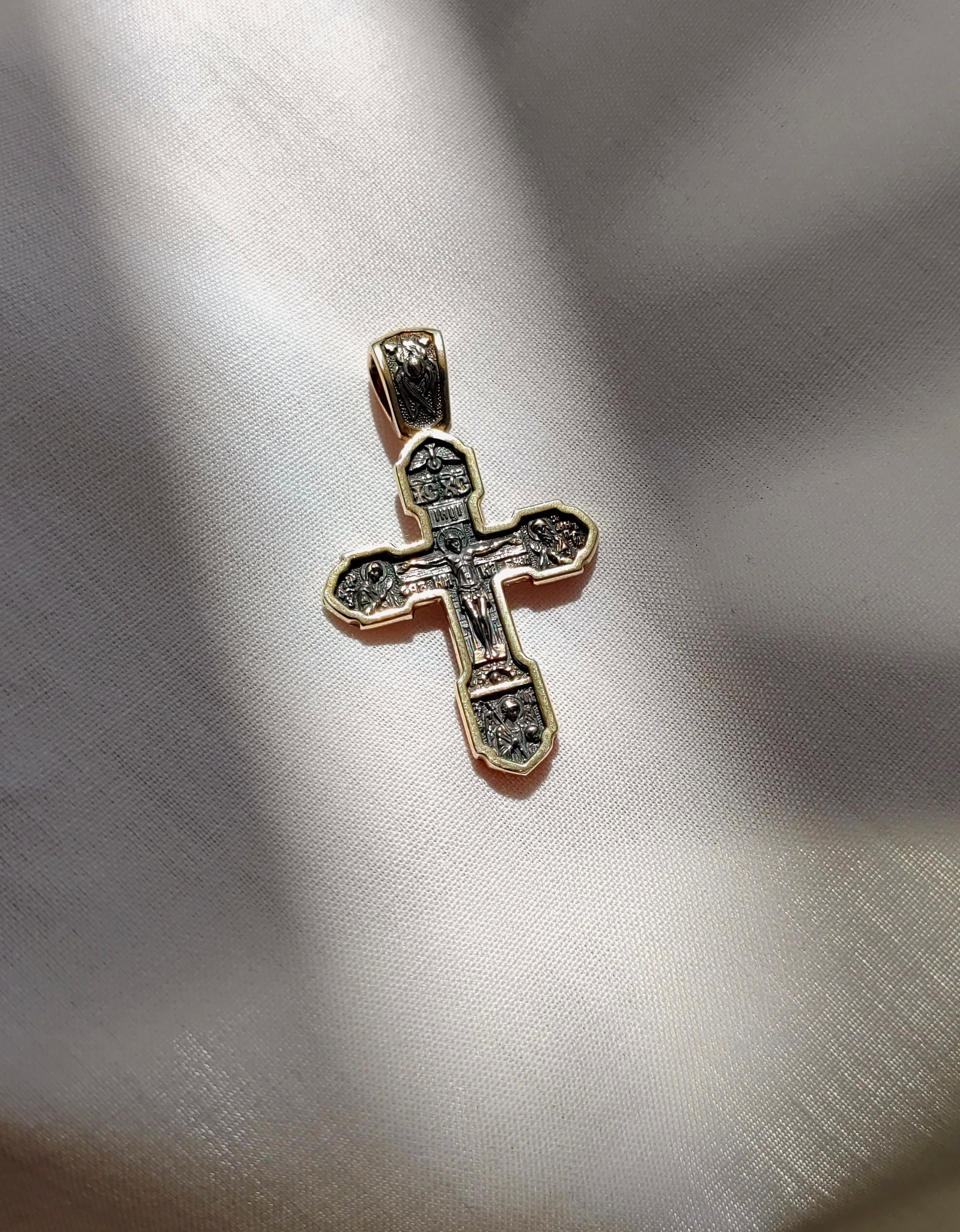 "A beautiful Orthodox cross with an inlaid crucifixion of Jesus Christ. On both sides of Christ...