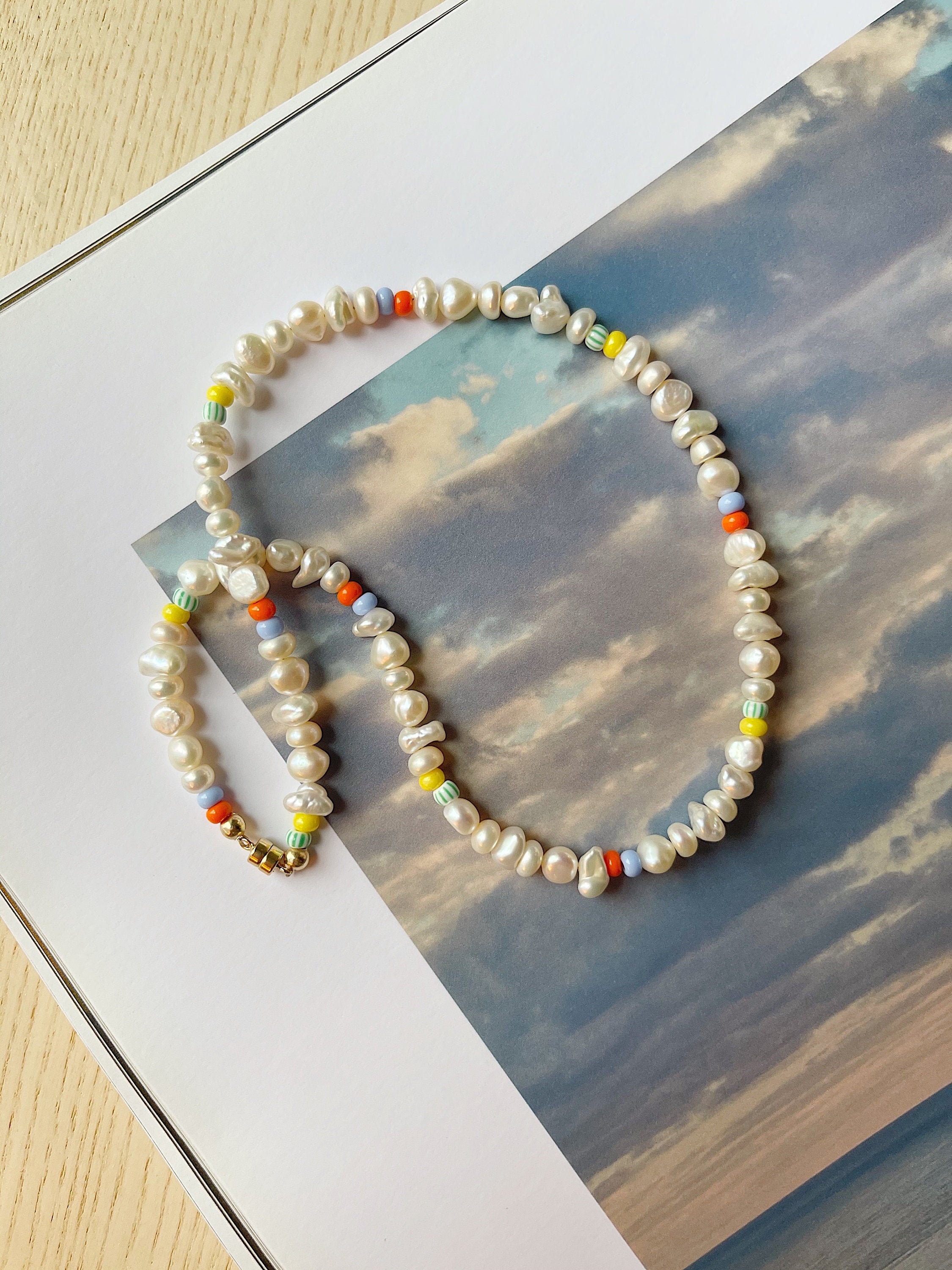"The Sailor Necklace - Genuine freshwater, irregular baroque pearls - Colorful glass seed beads...