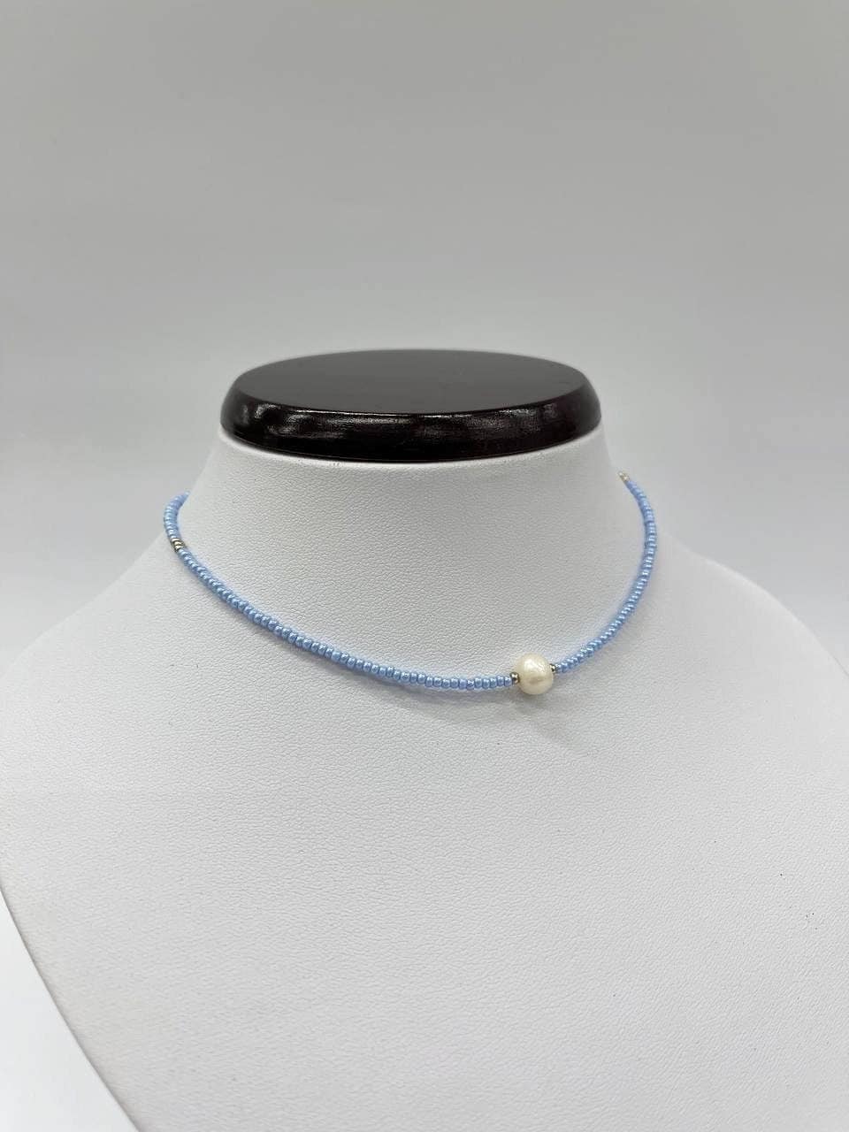 Pearl and seed beads necklace/light blue bead pearl necklace/mixed ...