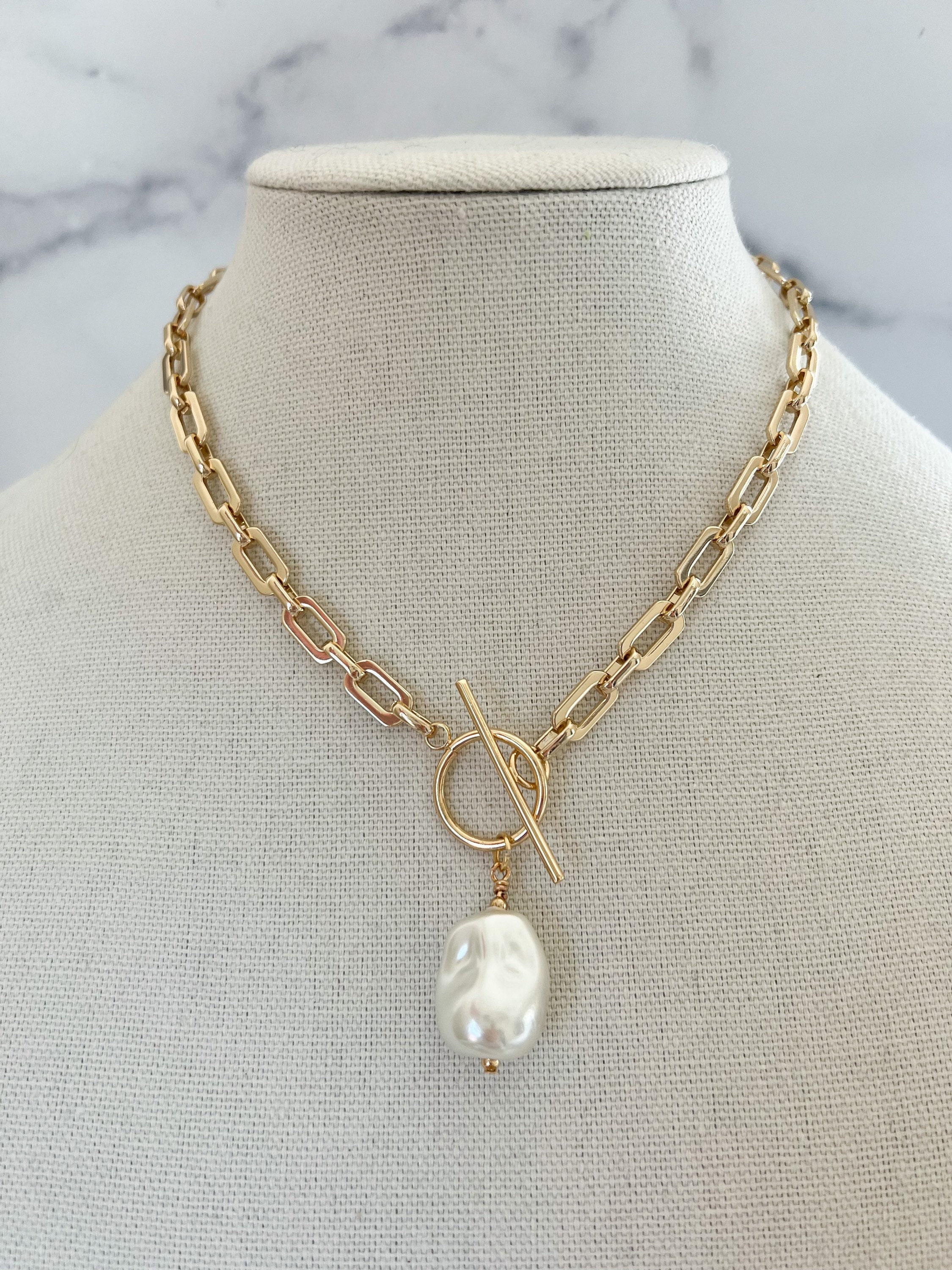 Baroque Pearl Necklace Gold Pearl Necklace Link Chain Necklace Larg...