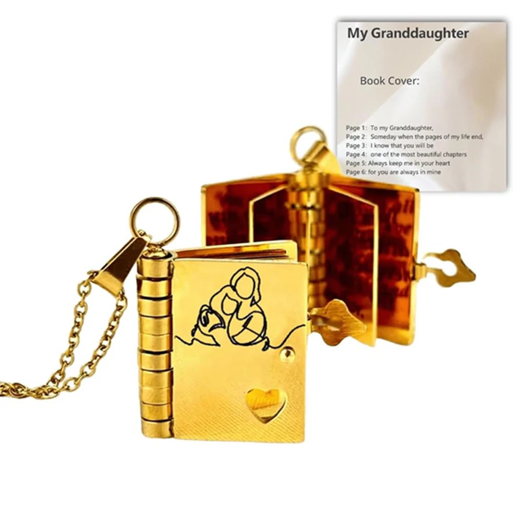 Openable Granddaughter Book Necklace Gold Color with Pages of Engraved Information Message Mini Book...