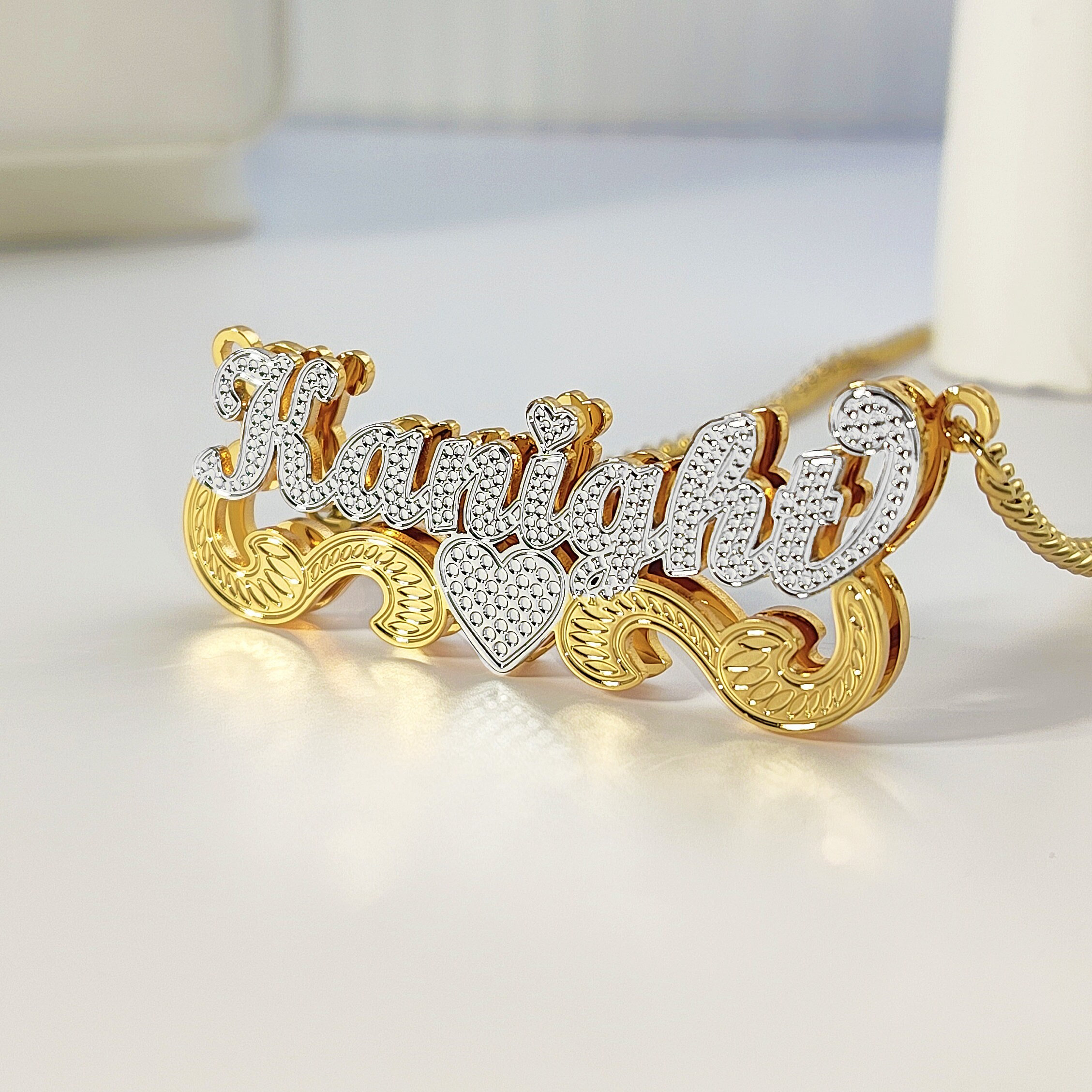 Double Heart Tone Two Nameplate Necklace, Custom Nameplate Pendant,...