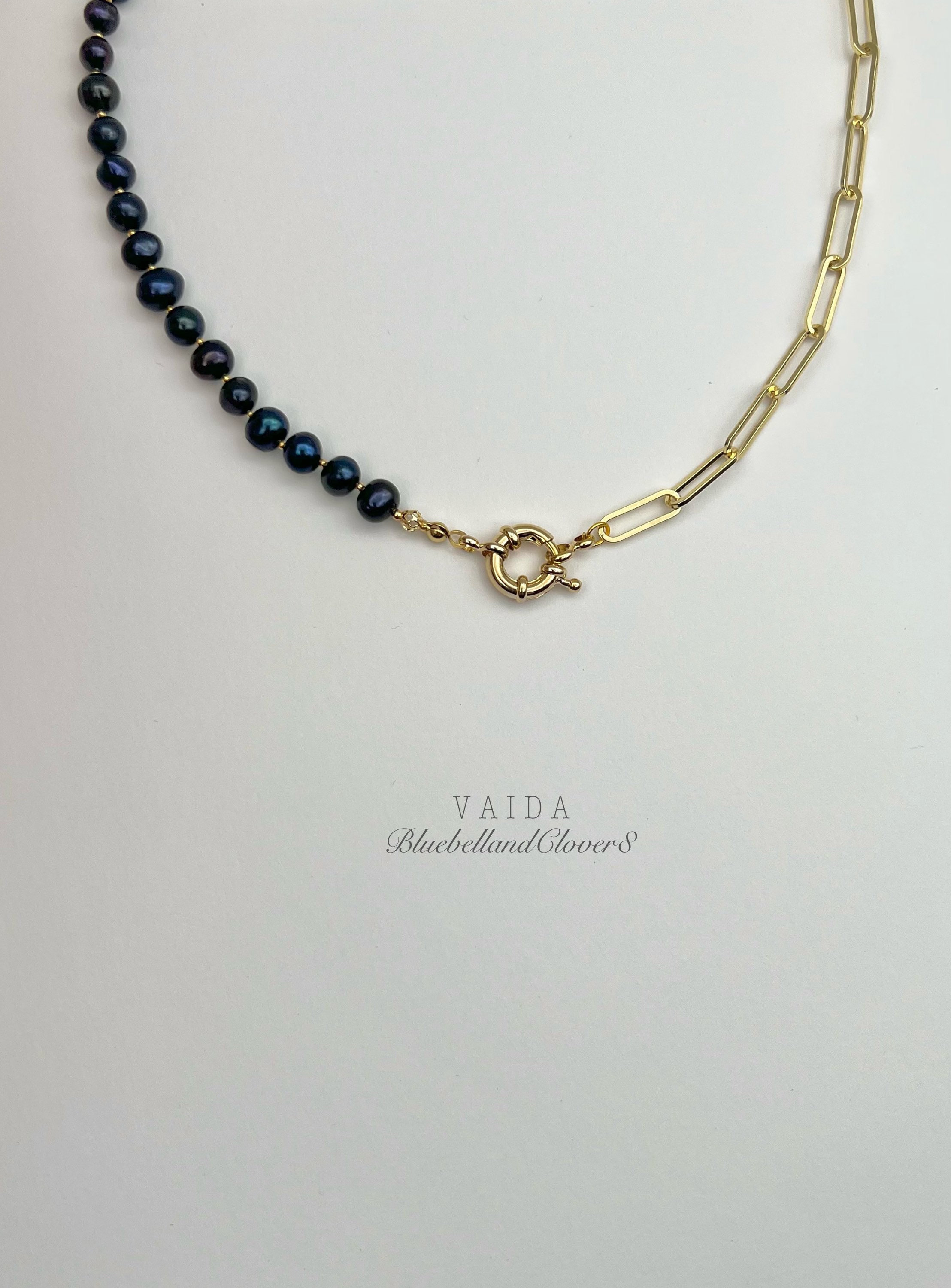 Half pearl Half 24k Gold filed paperclip chain Dark Purple pearl Ne...