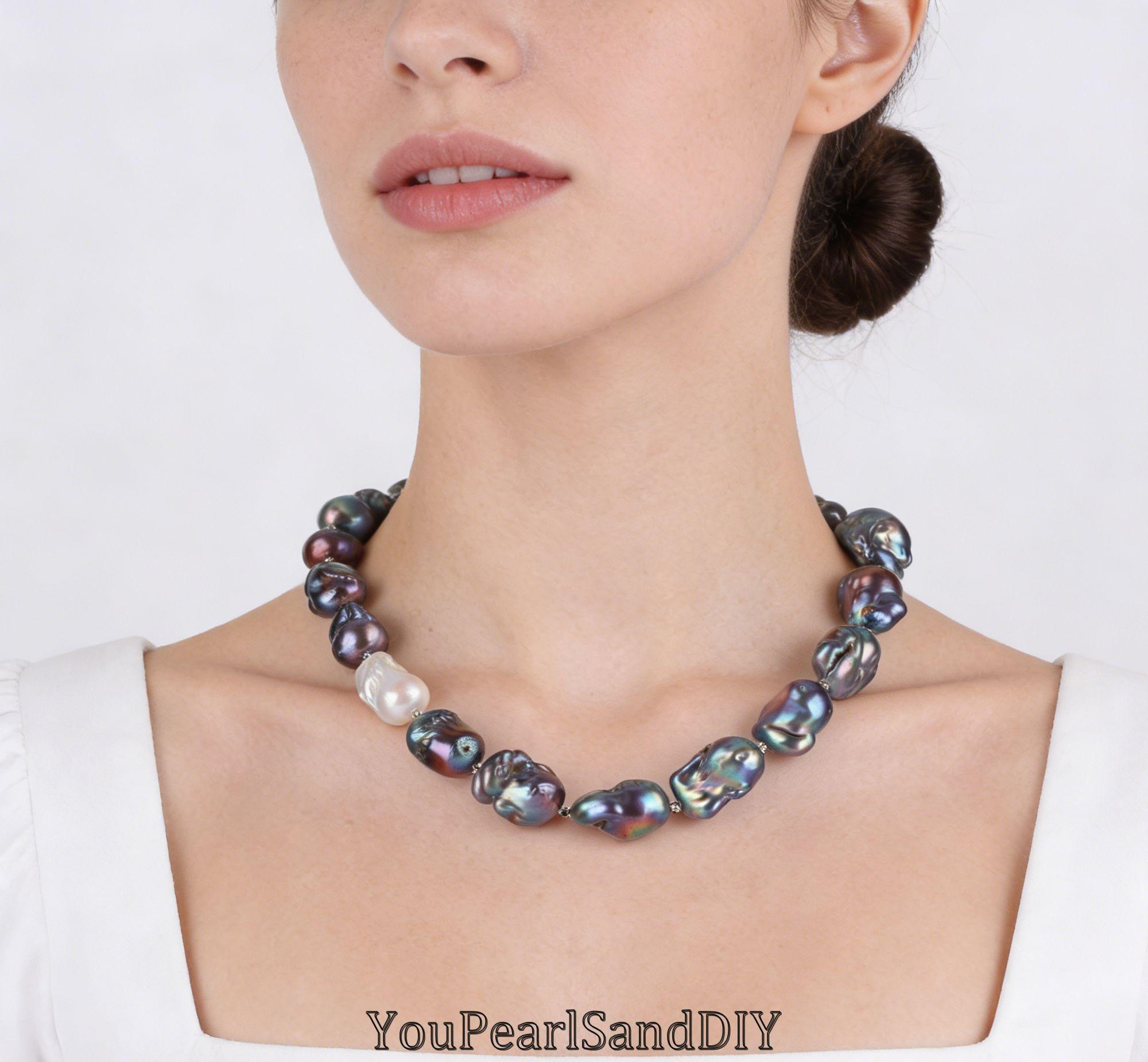 14-16x18-25MM Peacock Black Baroque Pearl Necklace with White Pearl...