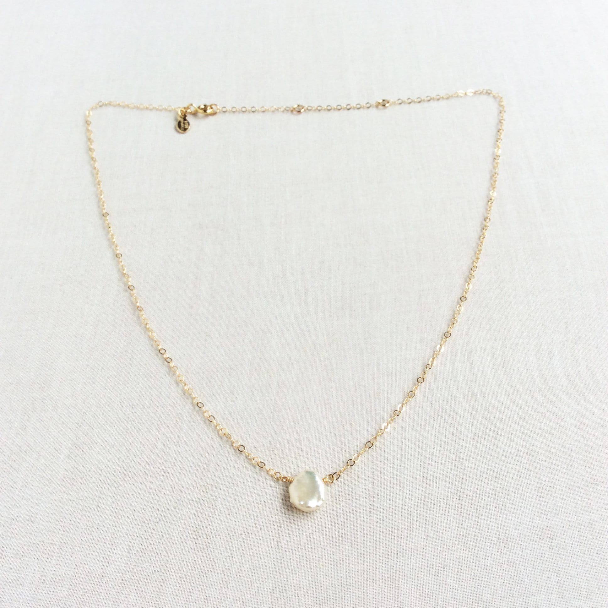 "Simple and timeless, this dainty necklace features a single pearl with a slightly oblong shape...
