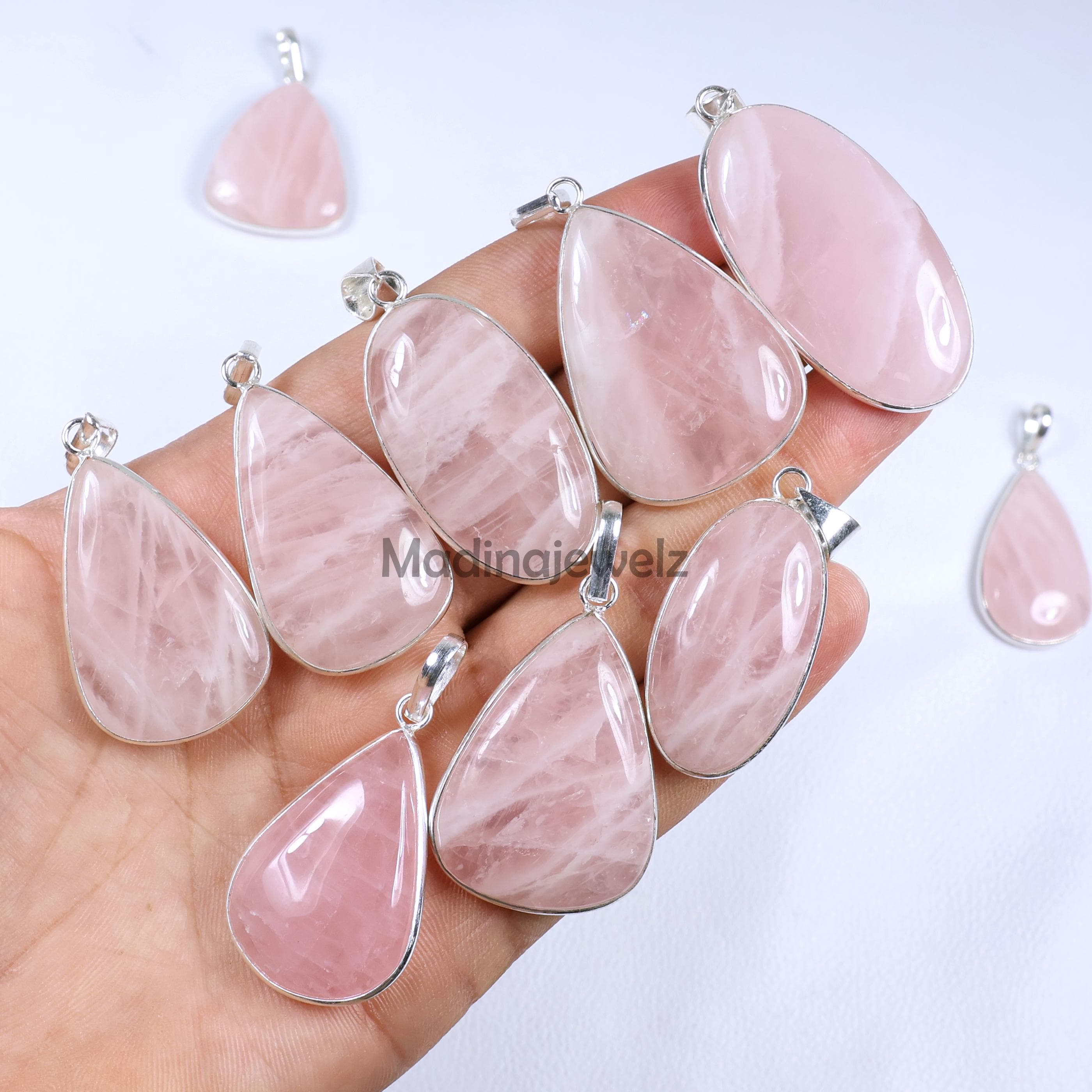 DESCRIPTION Gemstone Name : Natural Rose Quartz Cut : Bezel Pendant Shape : Mix Shape and Size Lengt...