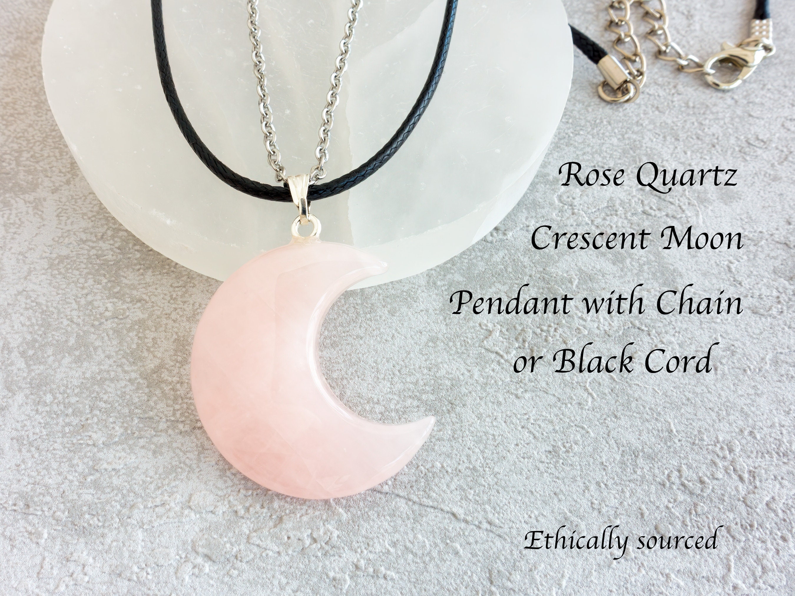 "Gorgeous Rose Quartz moon pendant in a lovely pink colour. Ethically sourced gemstone with no ...