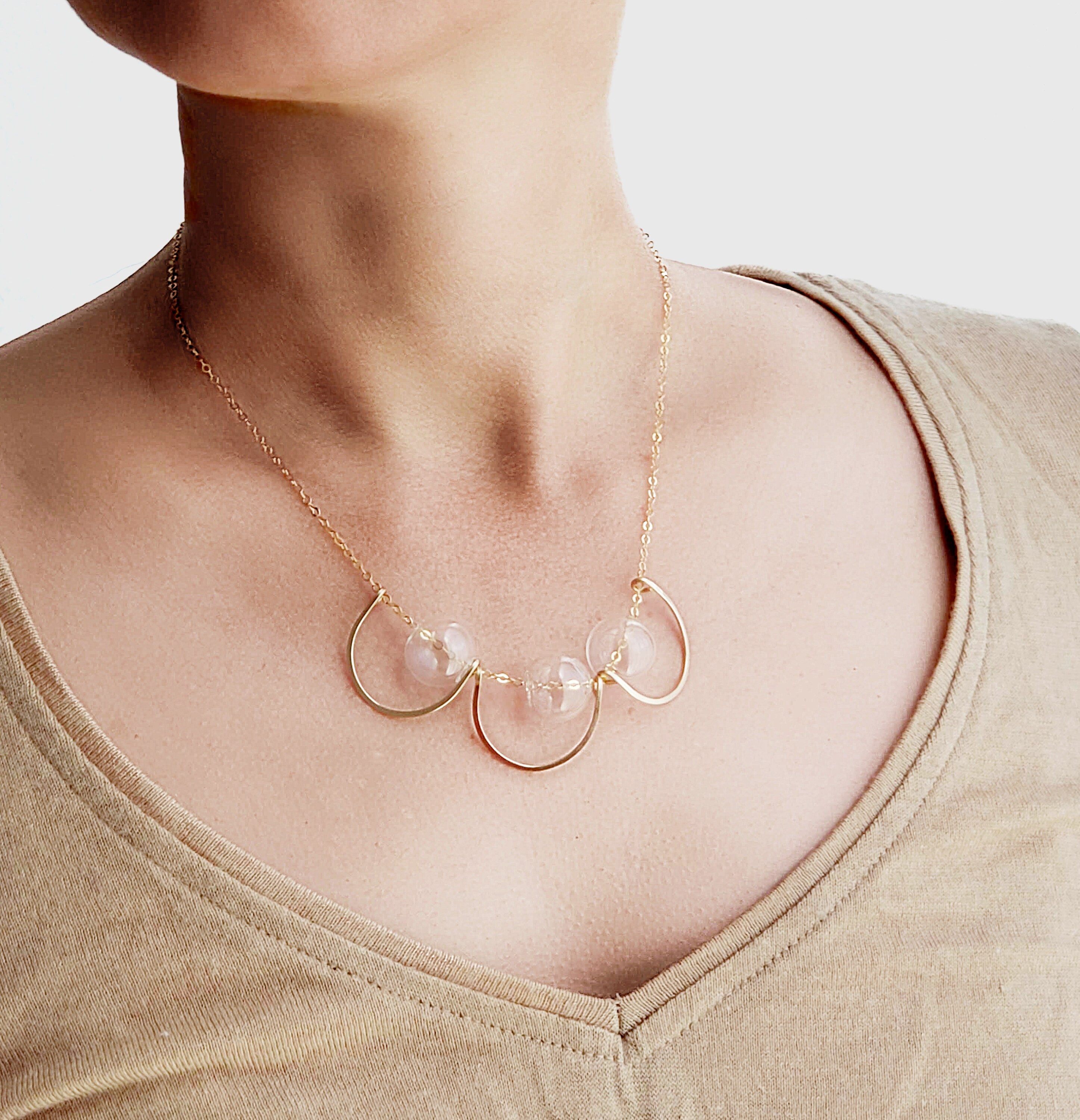 "Bubbles nesting in golden loops. + Chain Length: 16\" + Material: gold filled, borosilica...