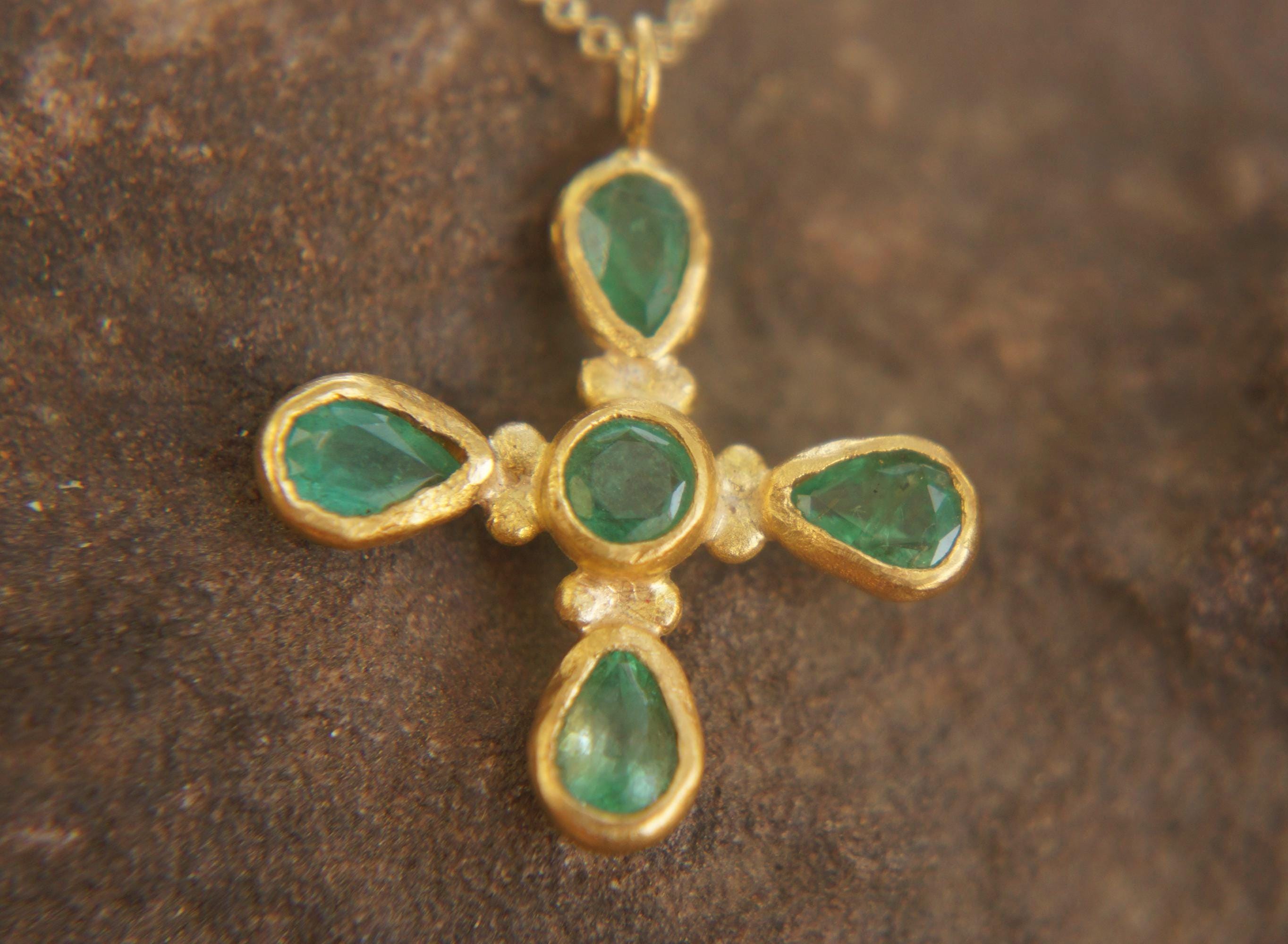 "24k gold emerald pendant//24k gold cross pendant//gold artisan cross//emerald gold cross penda...
