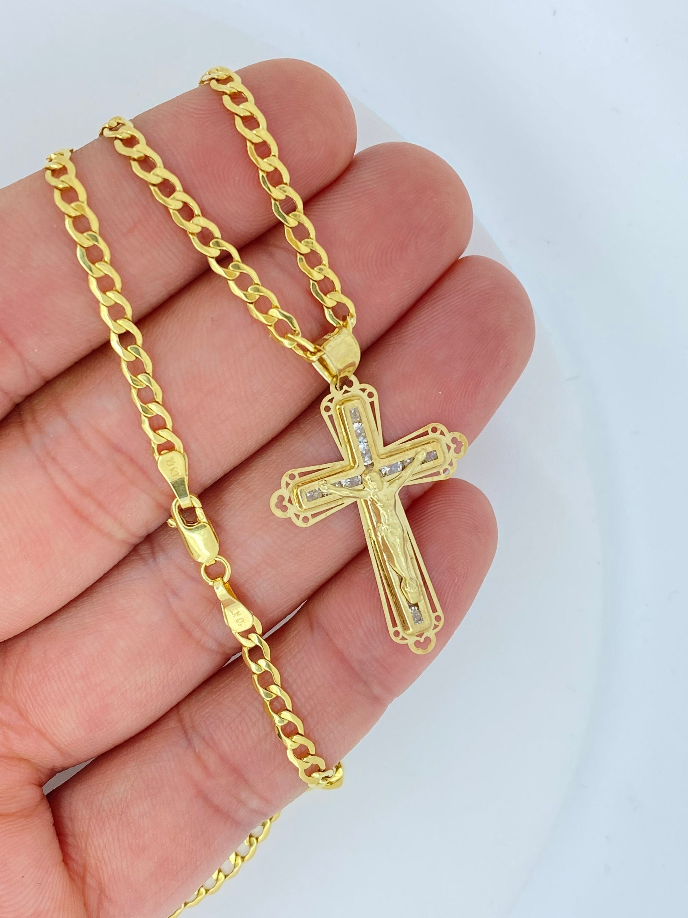 Mens 24k Gold Cross Chain, Gold Cuban Chain Cross Pendant, Mens Cro...