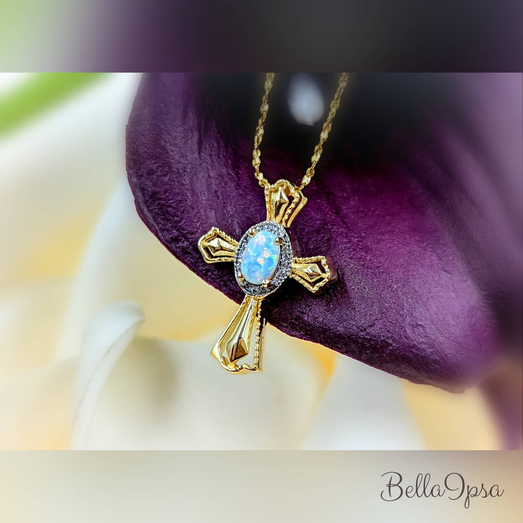 "This necklace is a stunning 925 sterling silver gold Opal cross pendant. A beautiful little cr...