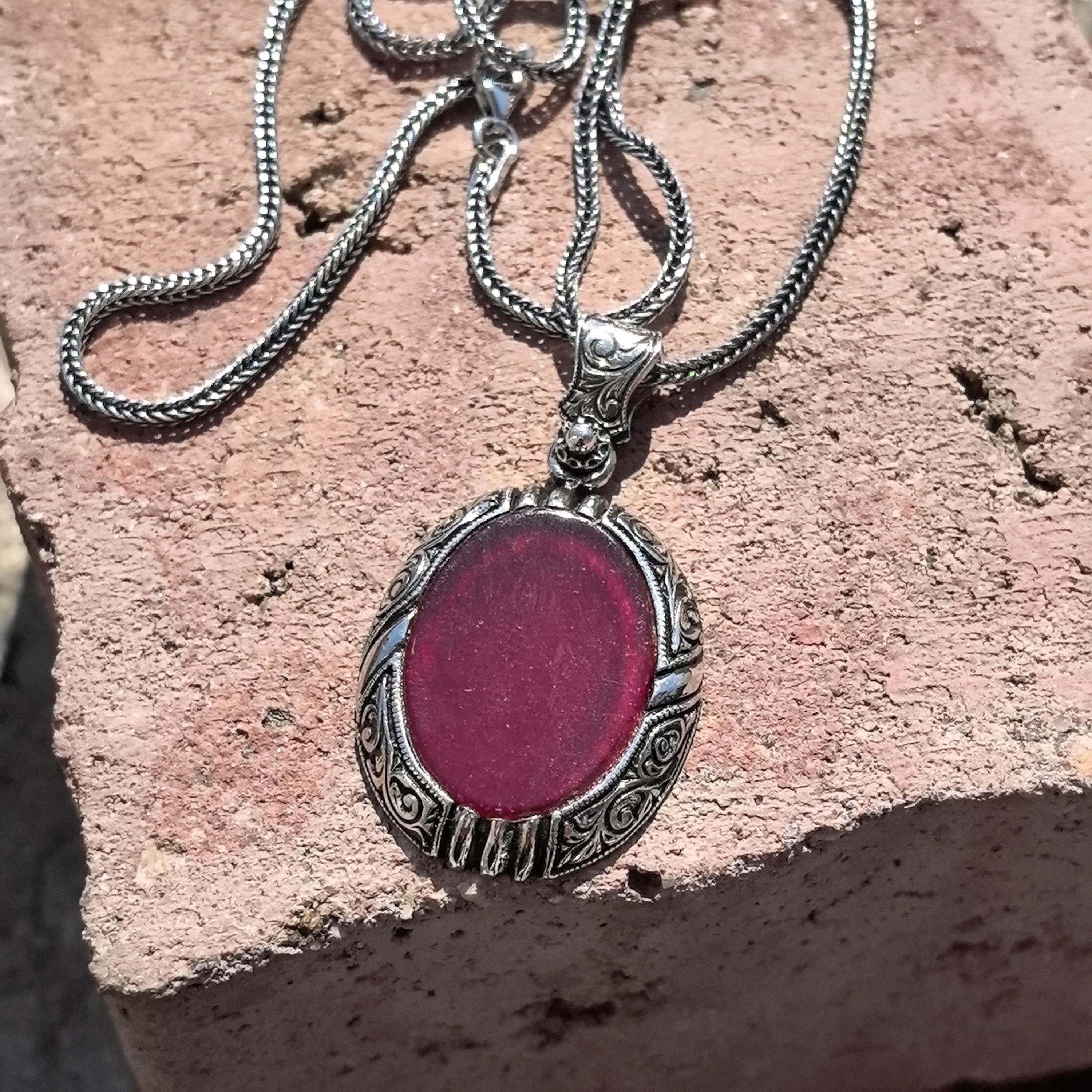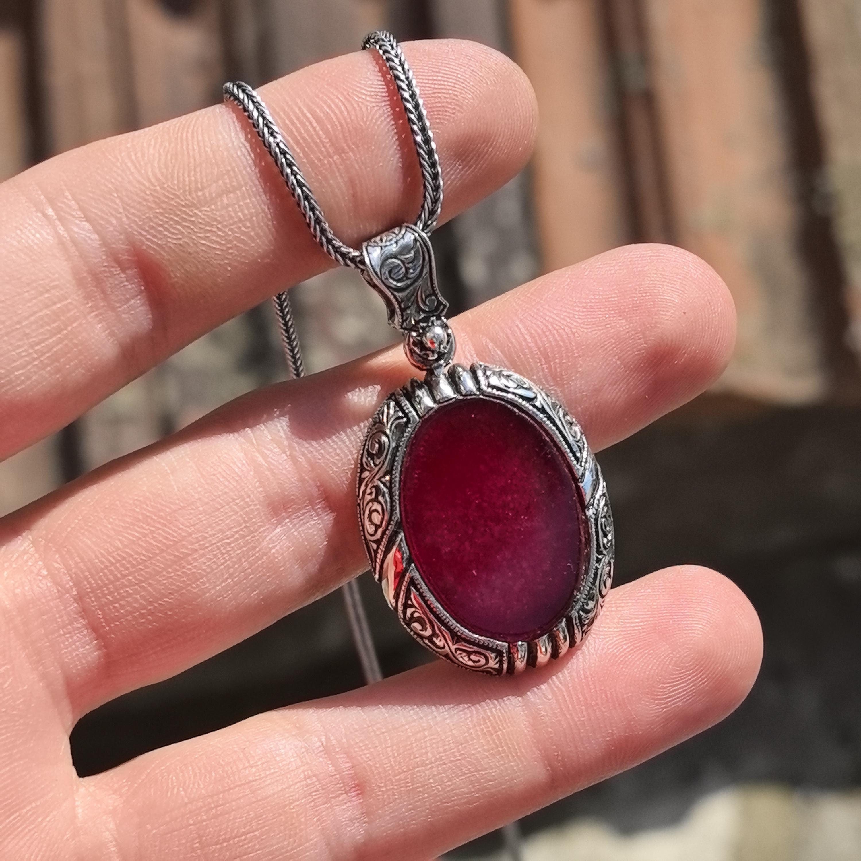 Men Silver Ruby Stone Pendant, Hand Engraved Ruby Stone Necklace, O...
