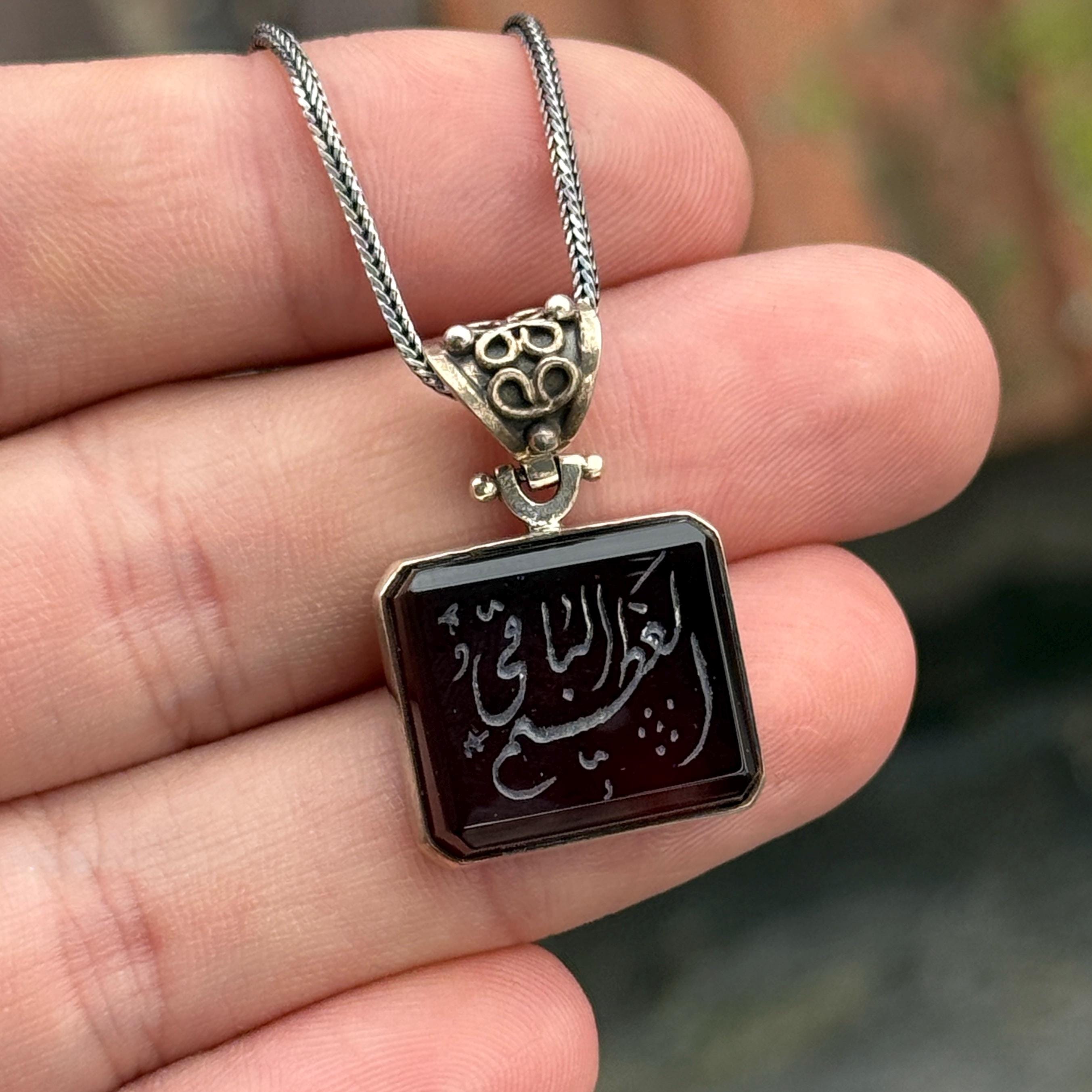 Silver Engraved Red Agate Islamic Necklace, Prayer Necklace Engraved on Stone, Dark Red Agate Silver...