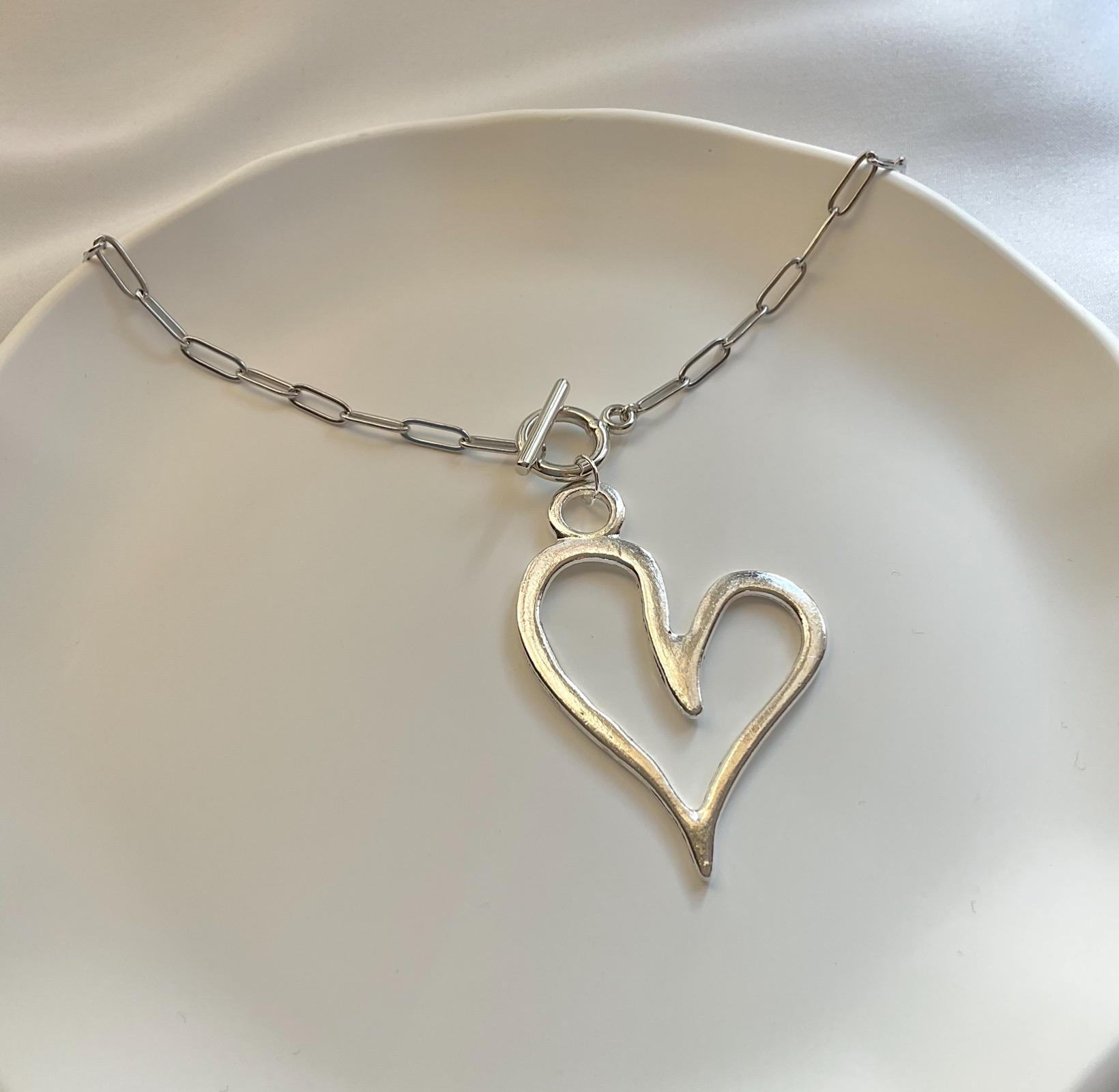 Large Silver Heart Pendant Necklace, Paperclip Chain, Statement Nec...