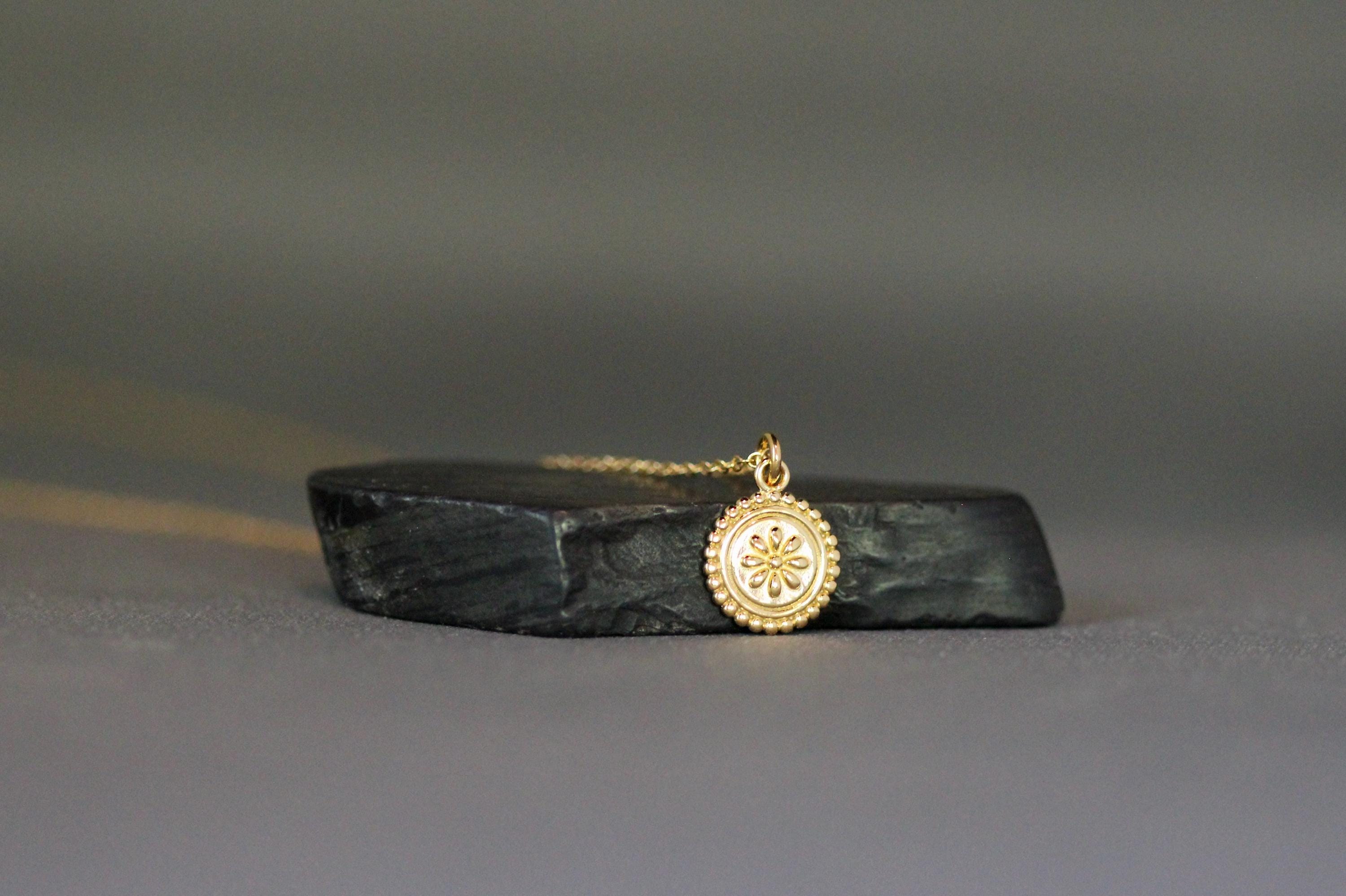 Gold Medallion Necklace - Small Round Gold Pendant - Gold Flower Ne...