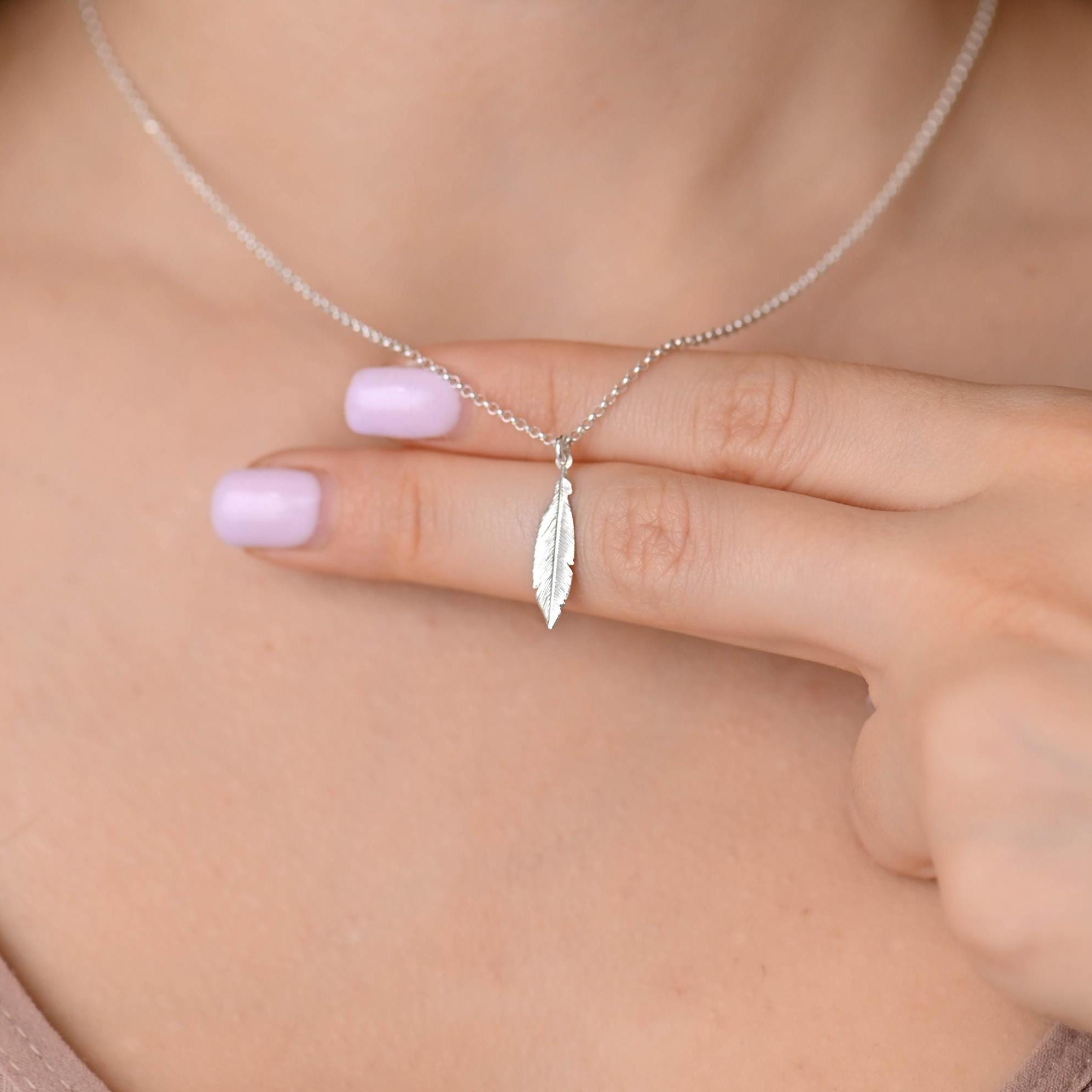 Small Feather Silver Necklace, Dainty Silver Necklace, Sterling Silver Necklaces for Women, Simple S...