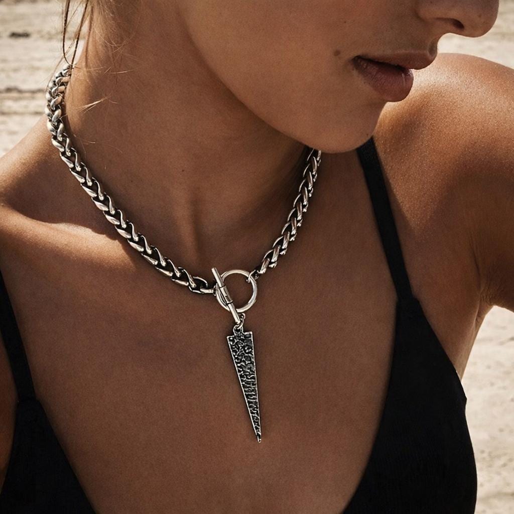 "Stunning stainless steel Necklace with Unique long triangle hammered Pendant, Statement Silver...