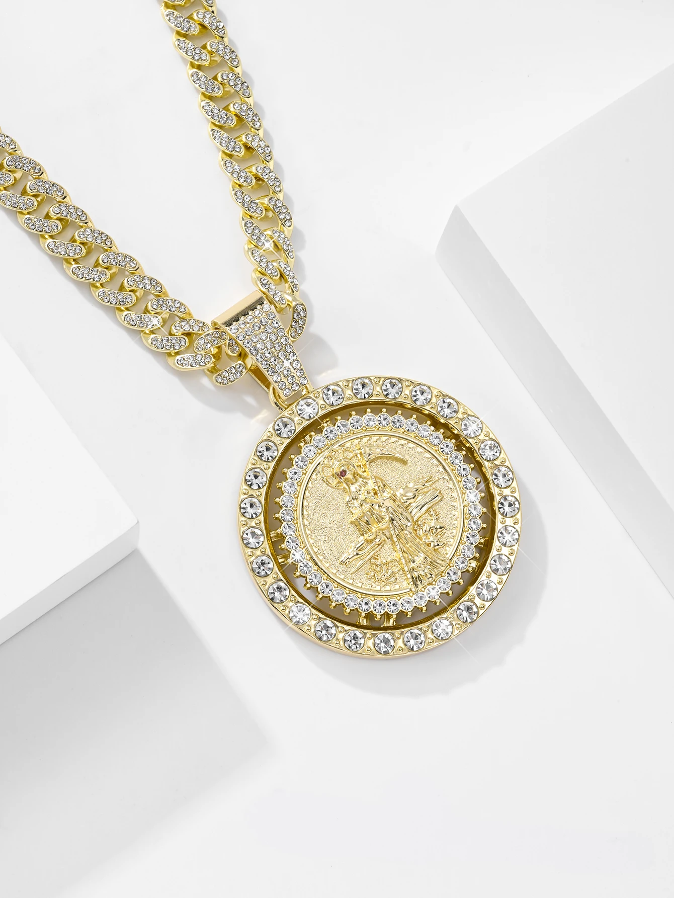 Stylish Saint Morte the God of Death Pendant Necklace with Rotatable Medal Pendant 14k Gold Plated C...