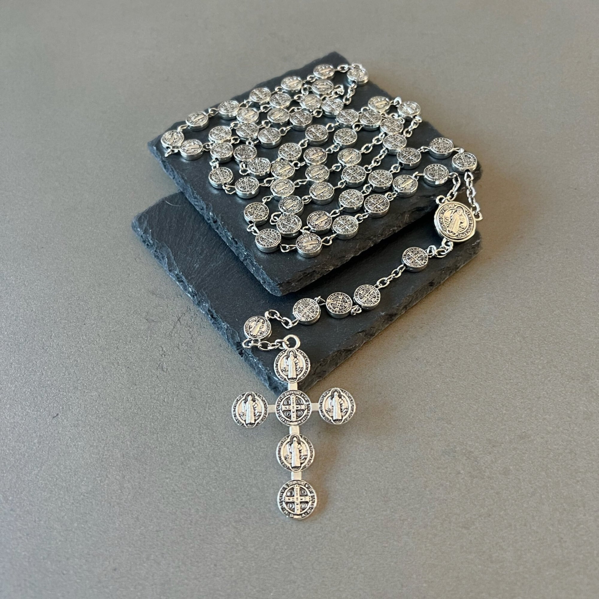 St Benedict cross Saint Benedict rosary necklace antique silver rosary Saint Benedict medal rosary w...