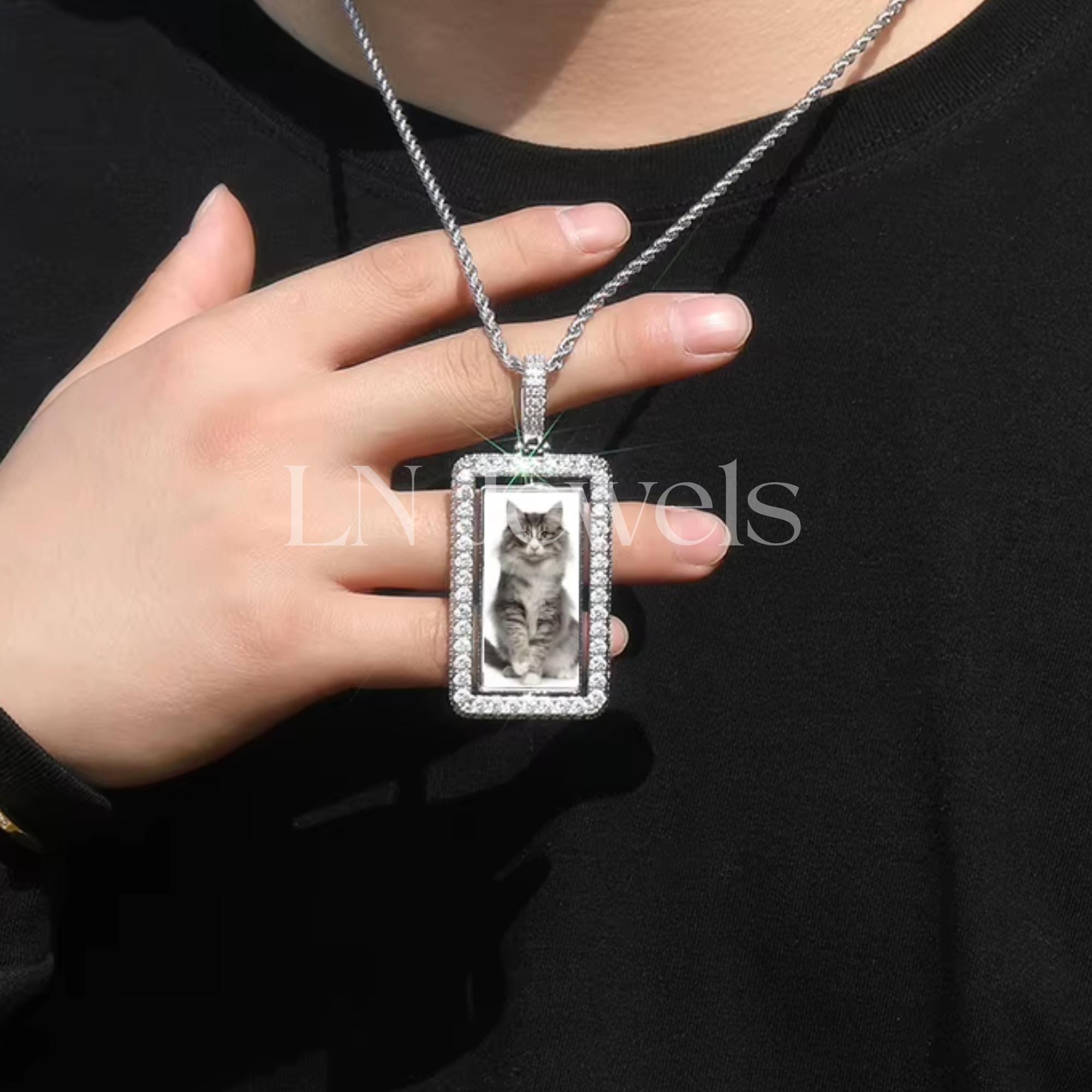 Round Moissanite Customize Rectangle Memory Photo Pendant, Custom M...