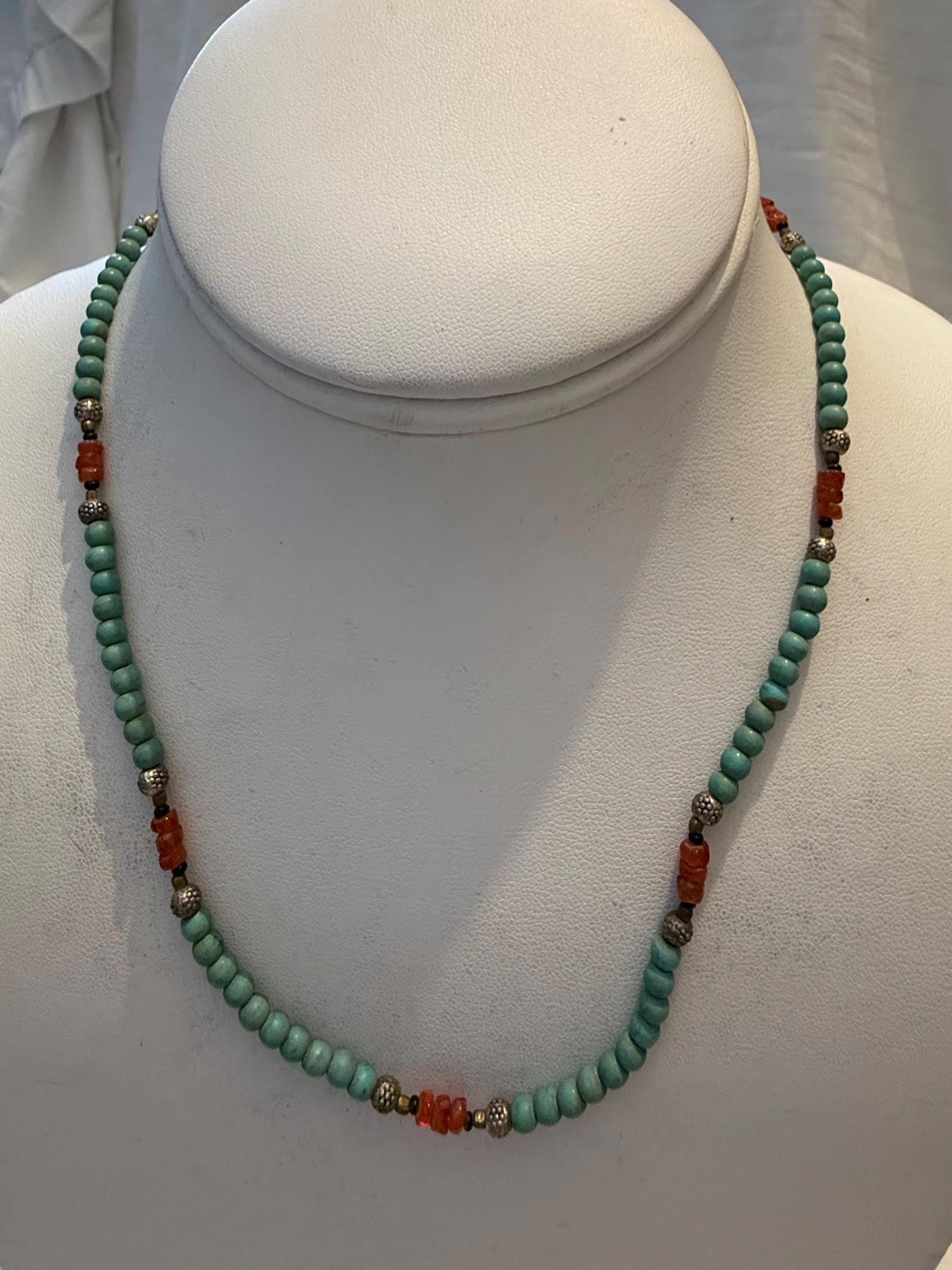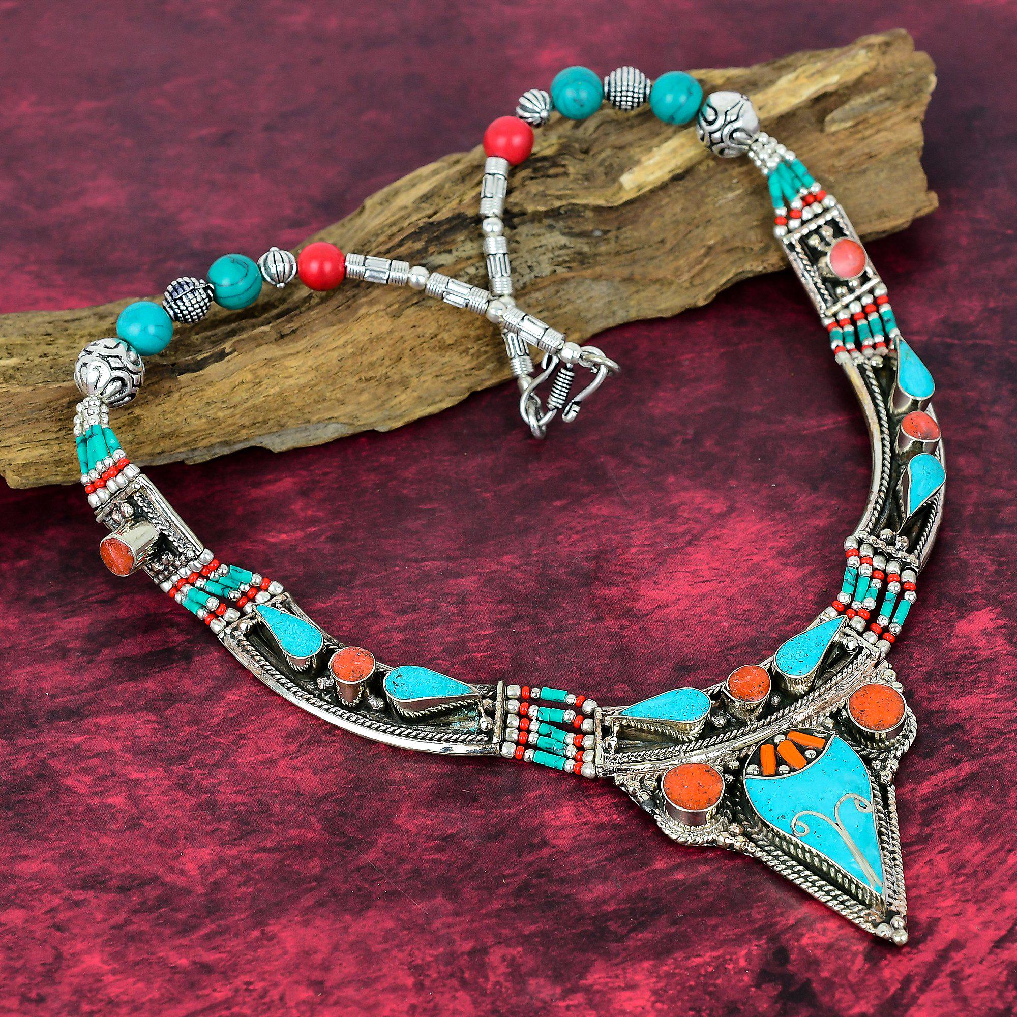 Dainty Turquoise, Coral Gemstone Necklace 925 Sterling Silver Tibetan Necklace Handmade Bohemian Nec...