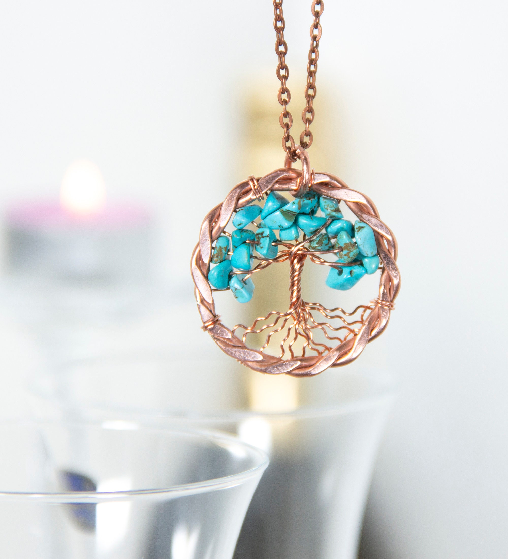 Copper Tree of Life Necklace, Turquoise Pebble, 7th Anniversary Gif...