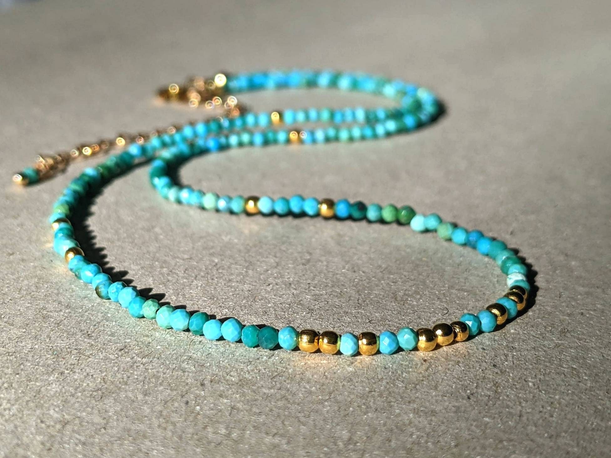 Enhance your style with our rustic beaded turquoise necklace. Featuring turquoise gemstones with gol...
