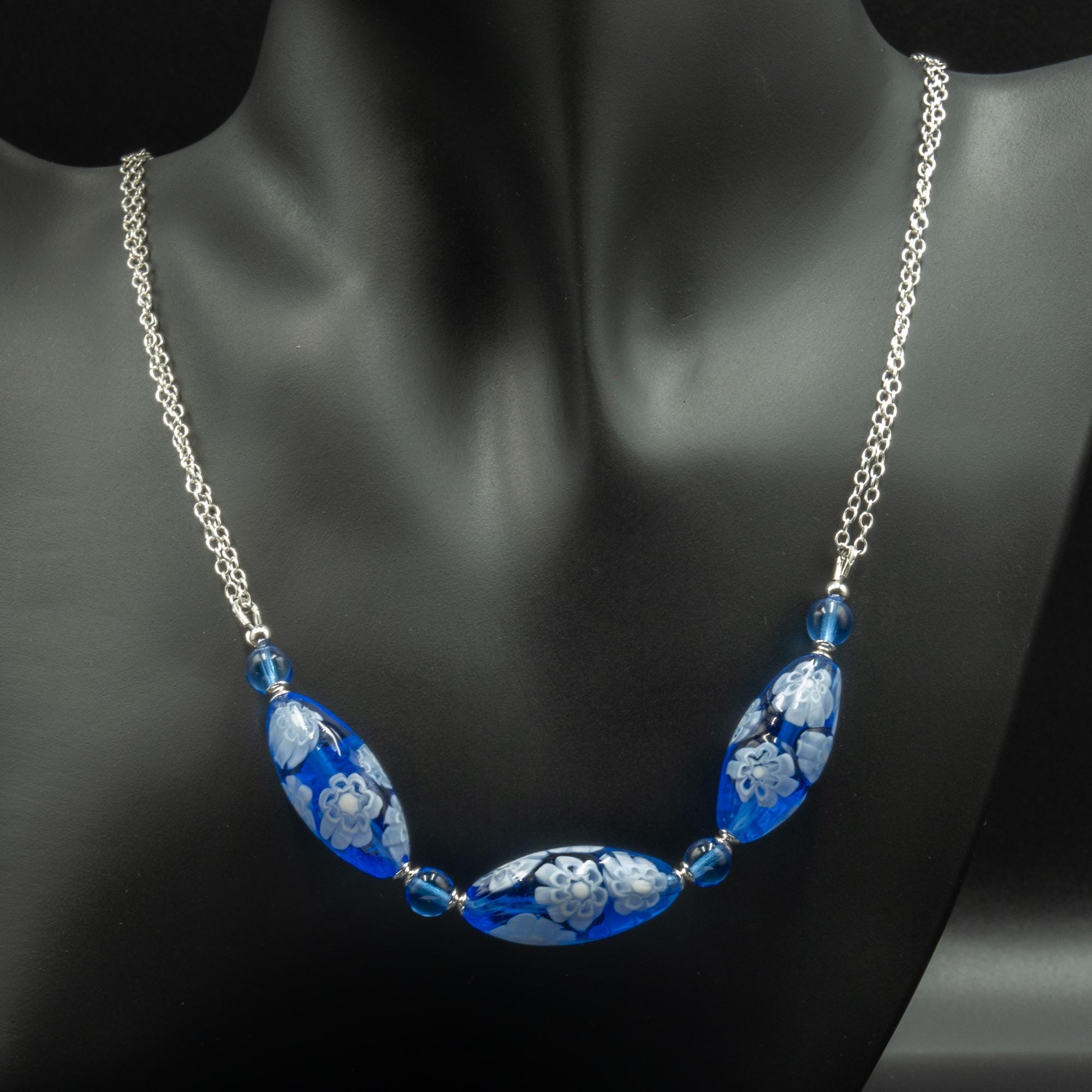 Murano sapphire blue Millefiori glass necklace - 3 long slim oval drops with a base of sapphire blue...