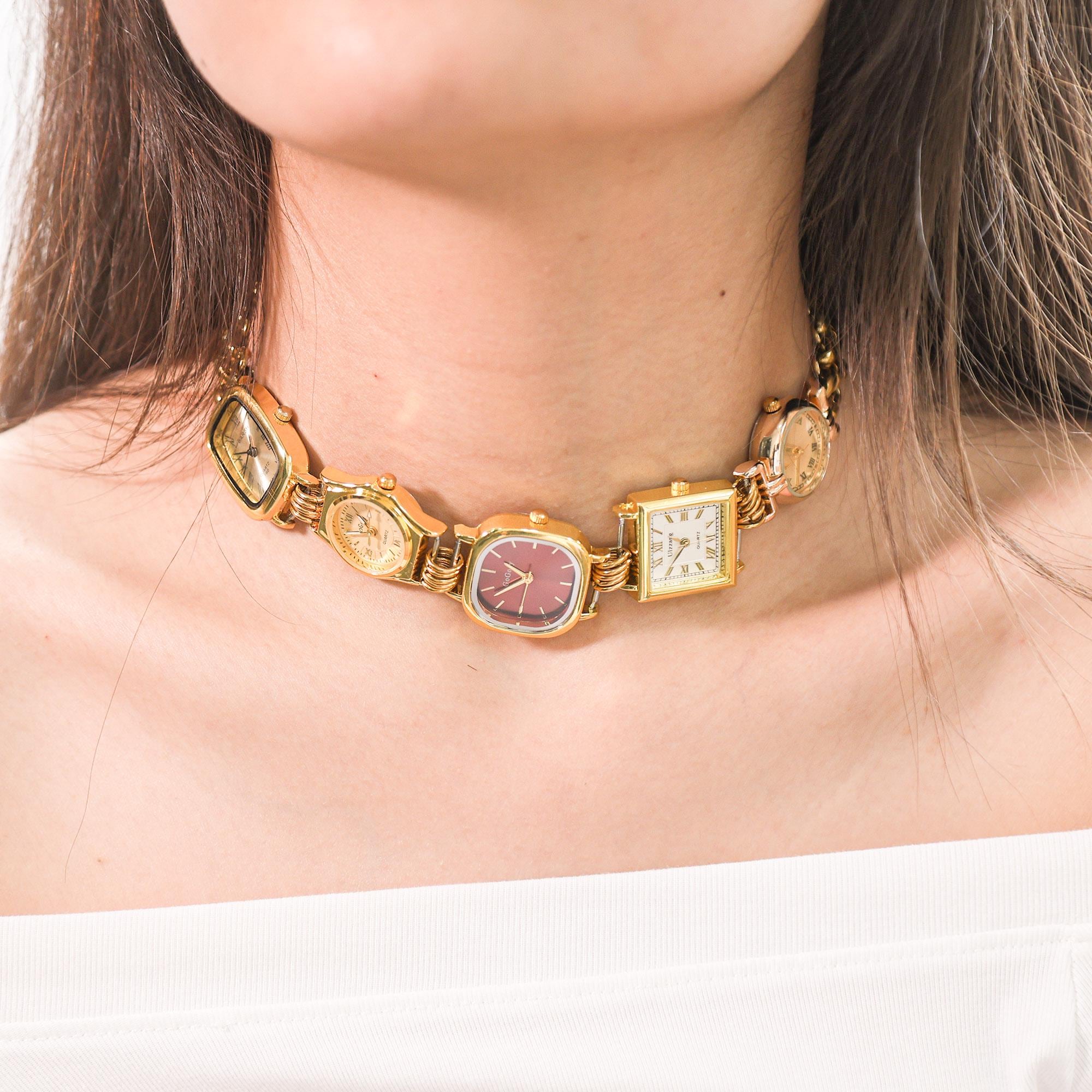 This necklace interweaves vintage charm with bold personality - a handmade five watch pendant, each ...