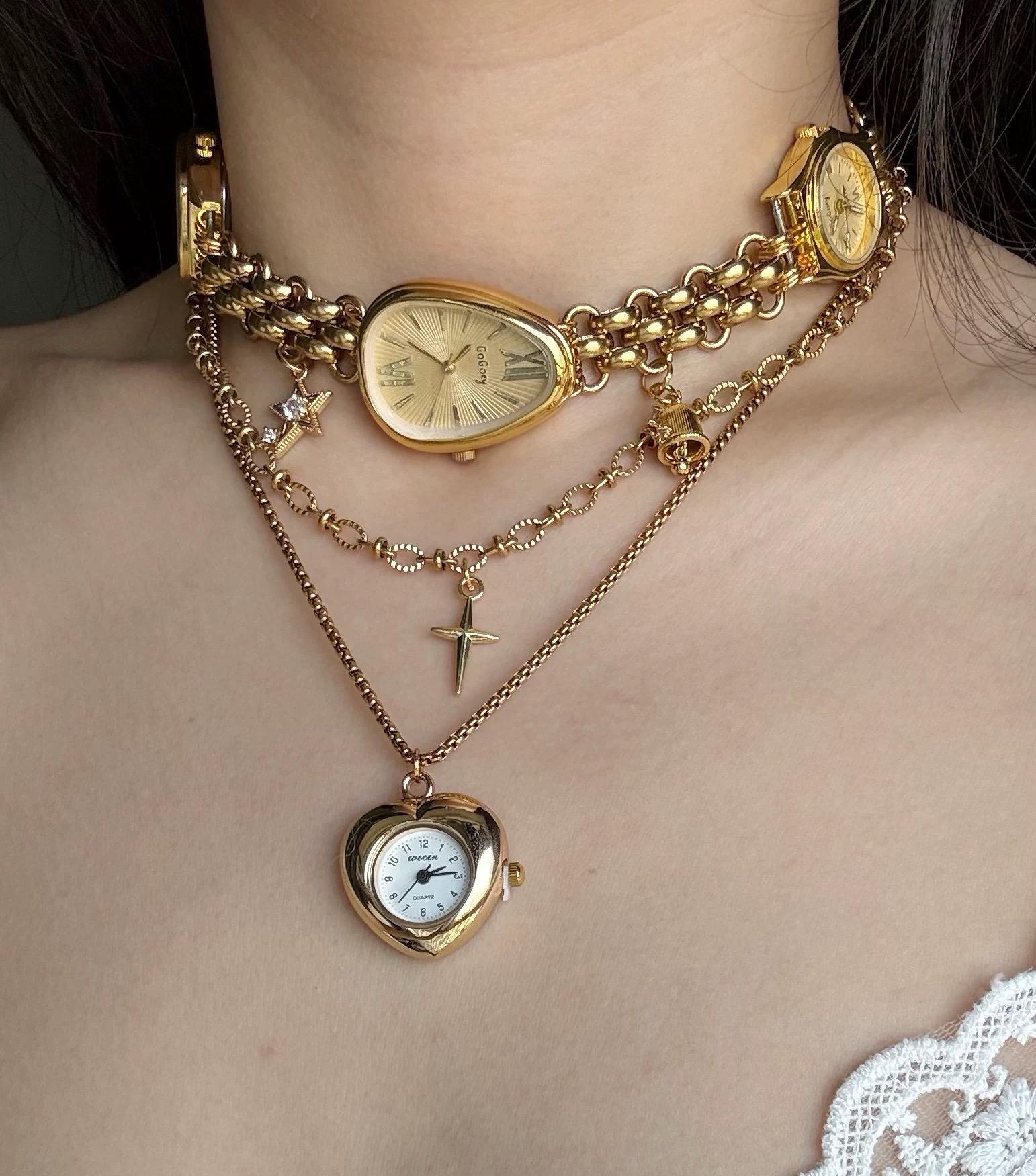 Vintage Gold Heart Watch Choker Necklace,Punk Triple Watch Necklace...