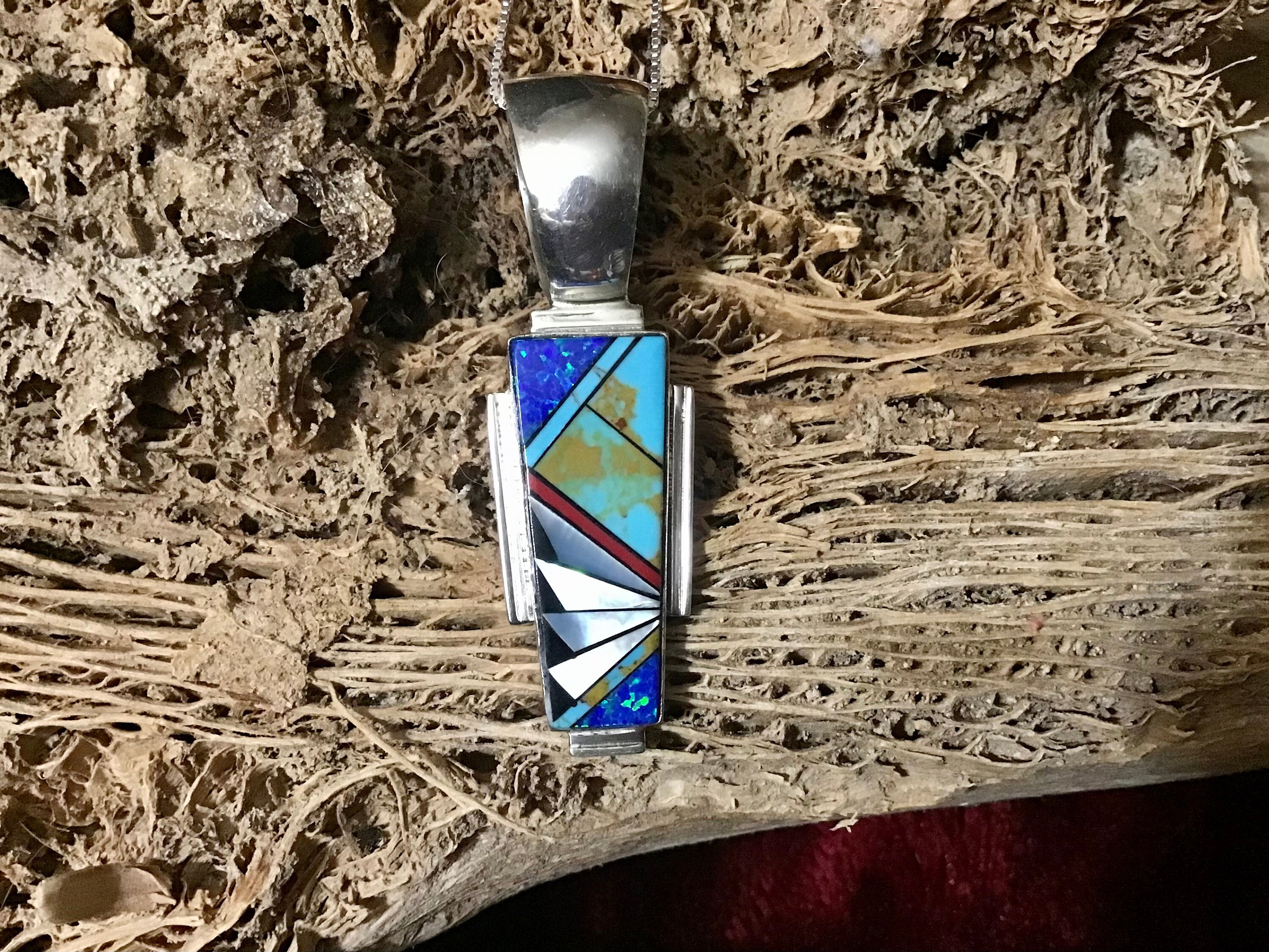 This Long Inlaid Zuni Turquoise Silver Pendant Necklace is a stunning piece of Native American jewel...
