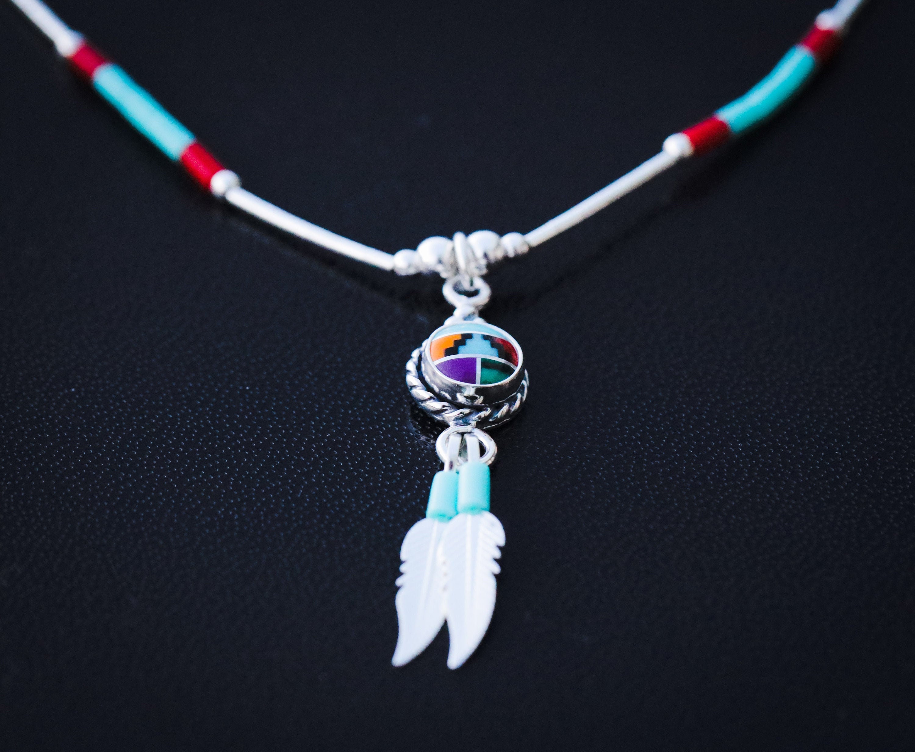 "Beautiful silver necklace with gemstones and feathers. This gorgeous Zuni style sun necklace i...
