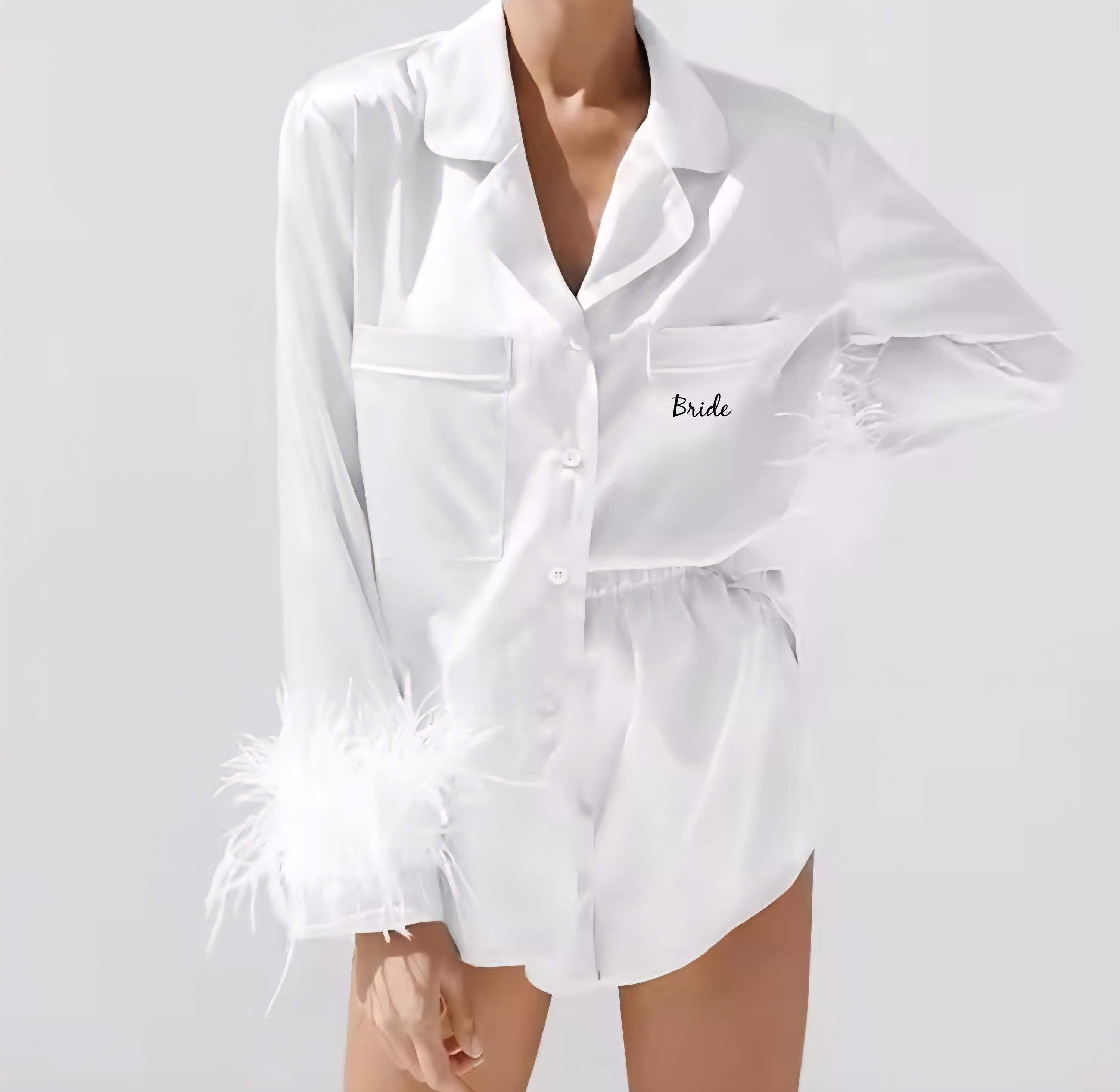 Stunning satin button up pyjamas with feathers on the arm sleeve cuffs. Personalised with 'Bride' on...