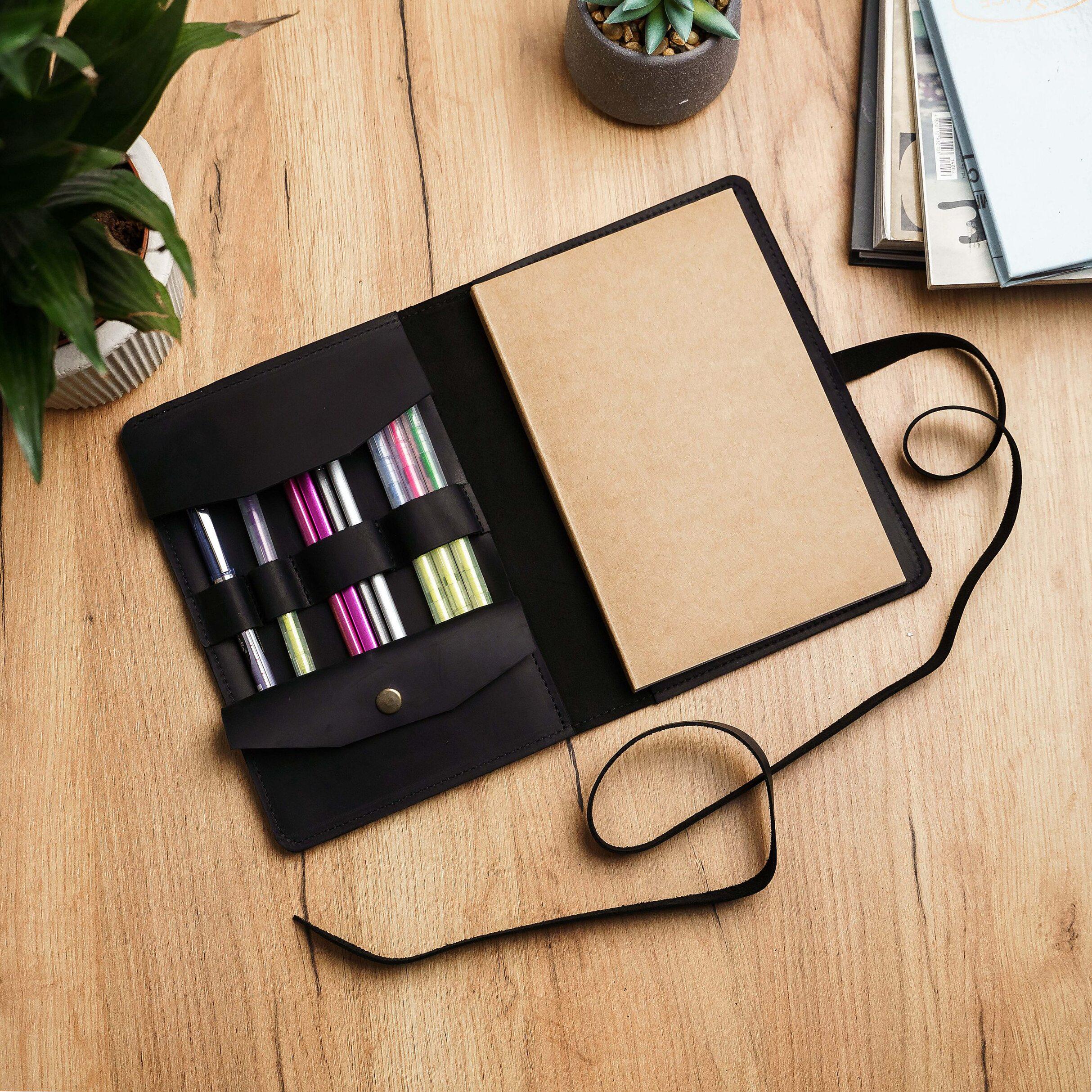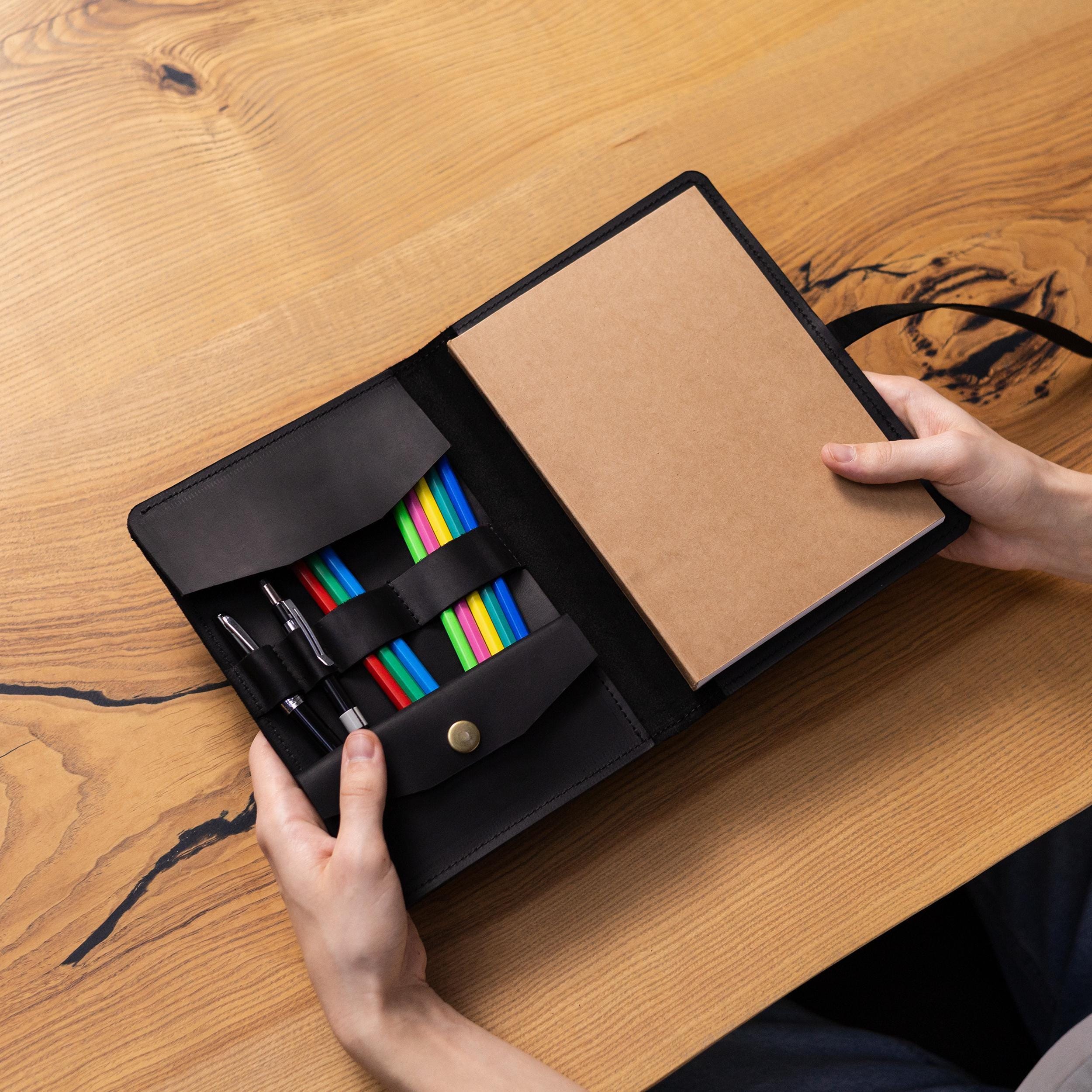 Black sketchbook cover, A5 sketchbook cover with pencil holder, Lar...