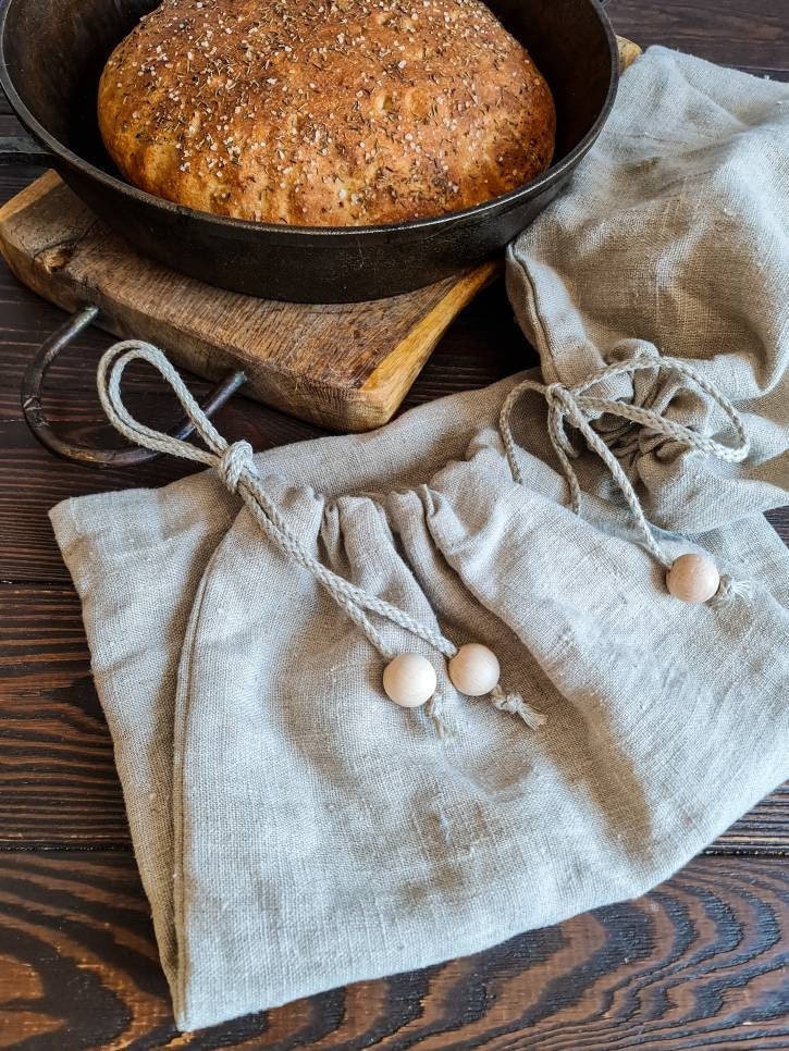 Linen bag with wooden beads detail, raw linen bread loaf bag, draws...