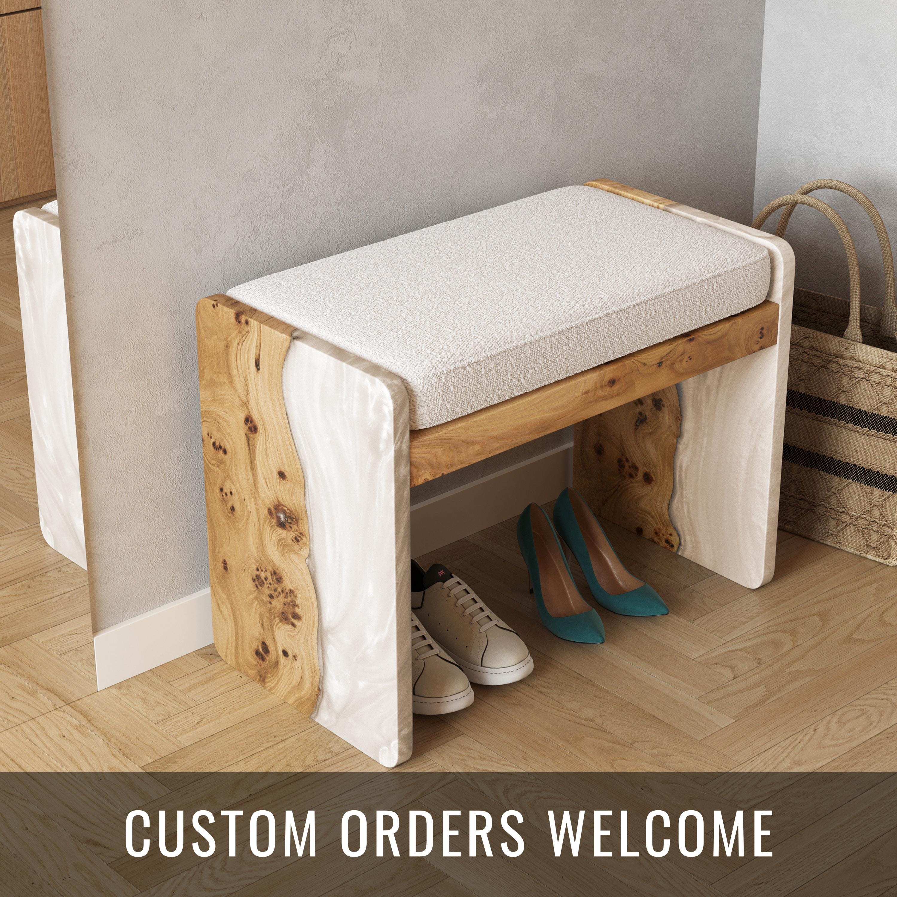 "Artistic hallway bench made of epoxy & wood - custom wooden benches with cushions for entr...
