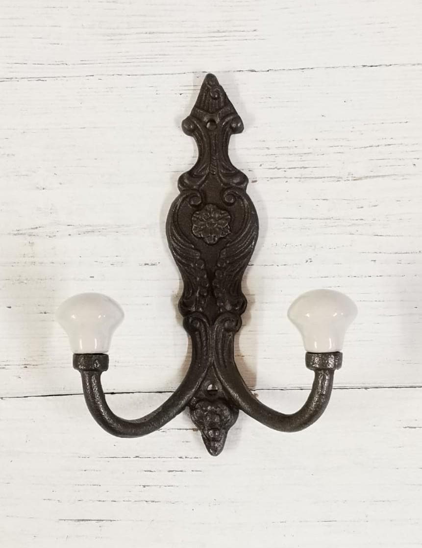 Cast antique Iron French Style Double White ceramic tip Coat Hook -...