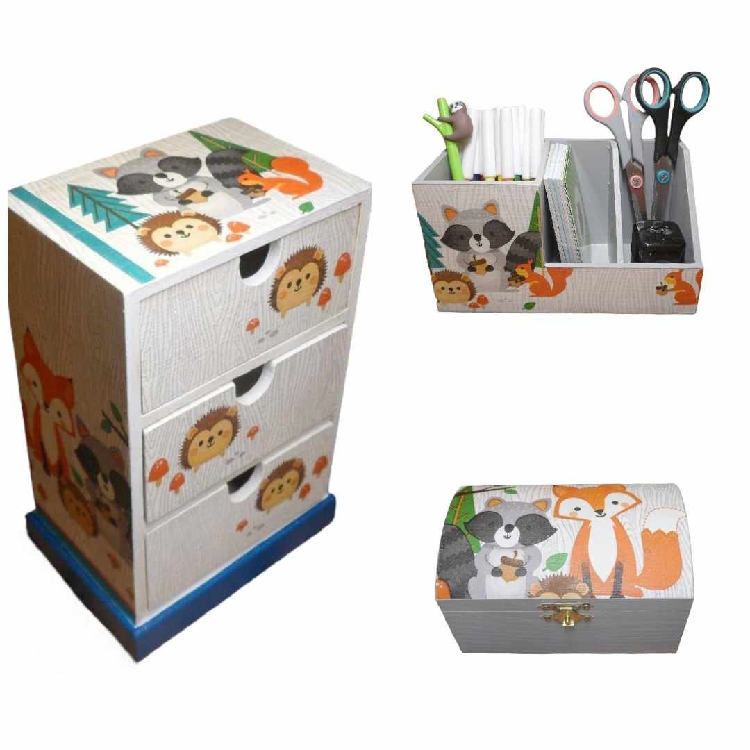 Set of pencil boxes, mini chest of drawers, small chest fox raccoon...
